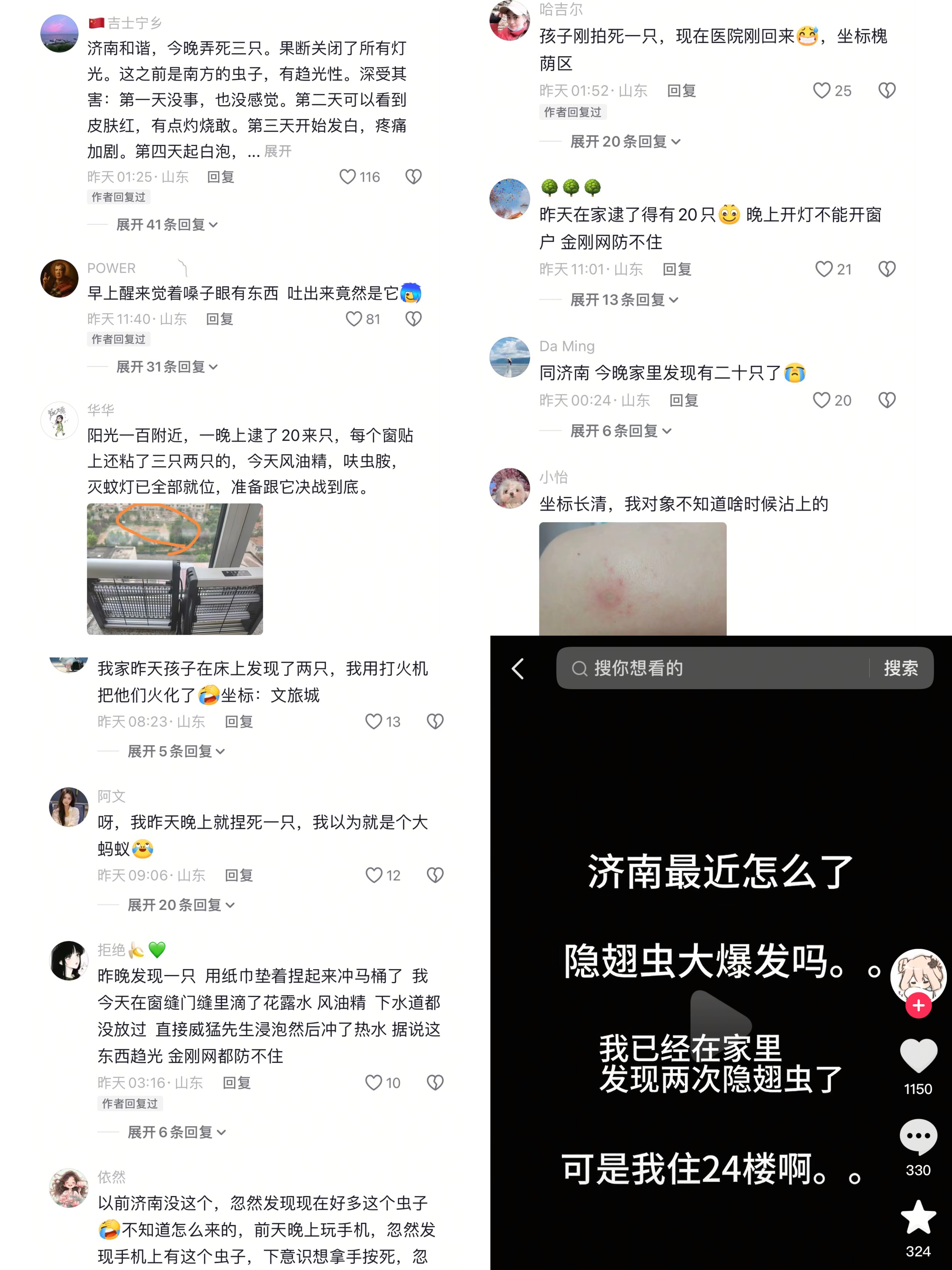 “近两天刷短视频,总能刷到济南网友说遇到隐翅虫,有的已经去医院了。”济南市民张女士的感受并非个例。记者在短视频平台发现,济南天桥区三孔桥街、历下区燕子山西路、浆水泉路、高新区、市中区和谐广场、山大兴隆山校区、文旅城、融汇城,以及章丘区、齐河县等多地,均有网友反映遇到过隐翅虫或因接触虫体出现了皮肤问题,隐翅虫的活跃已成为当前市民关注的民生热点。