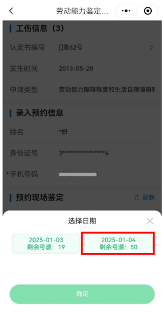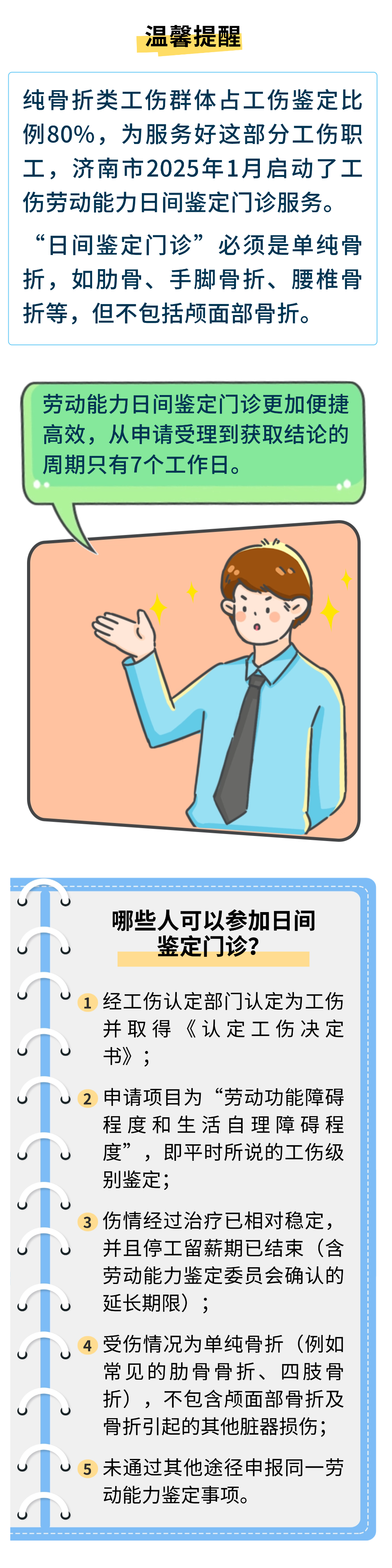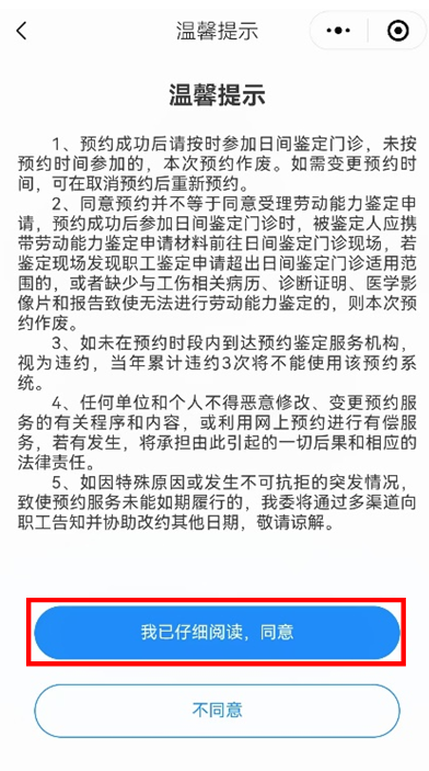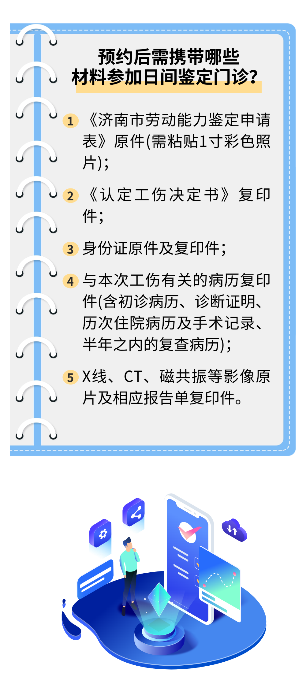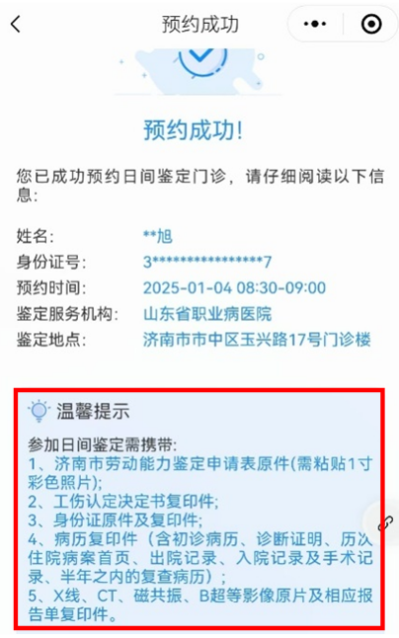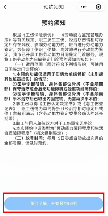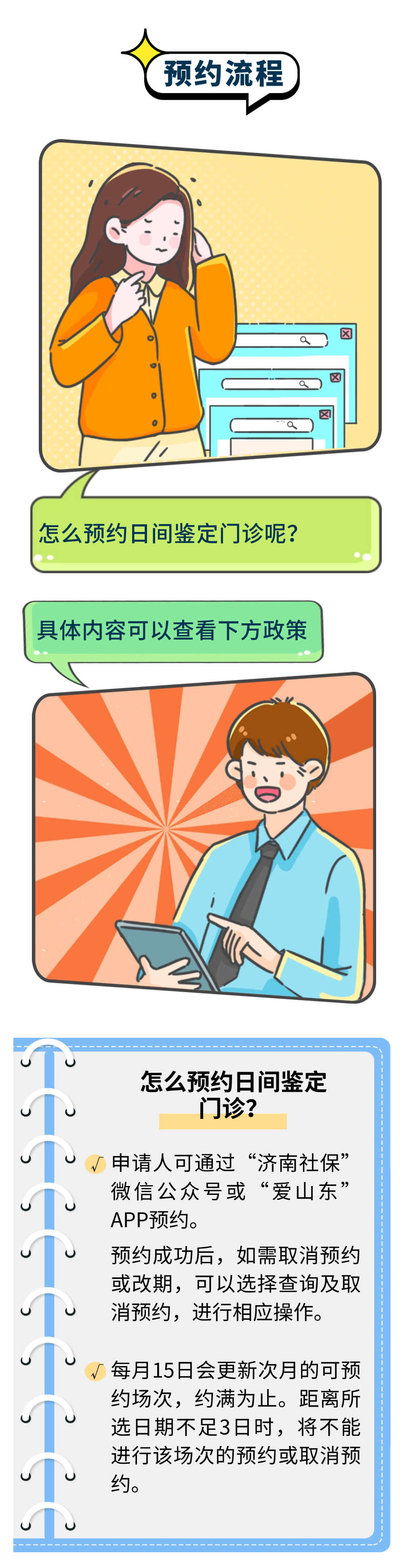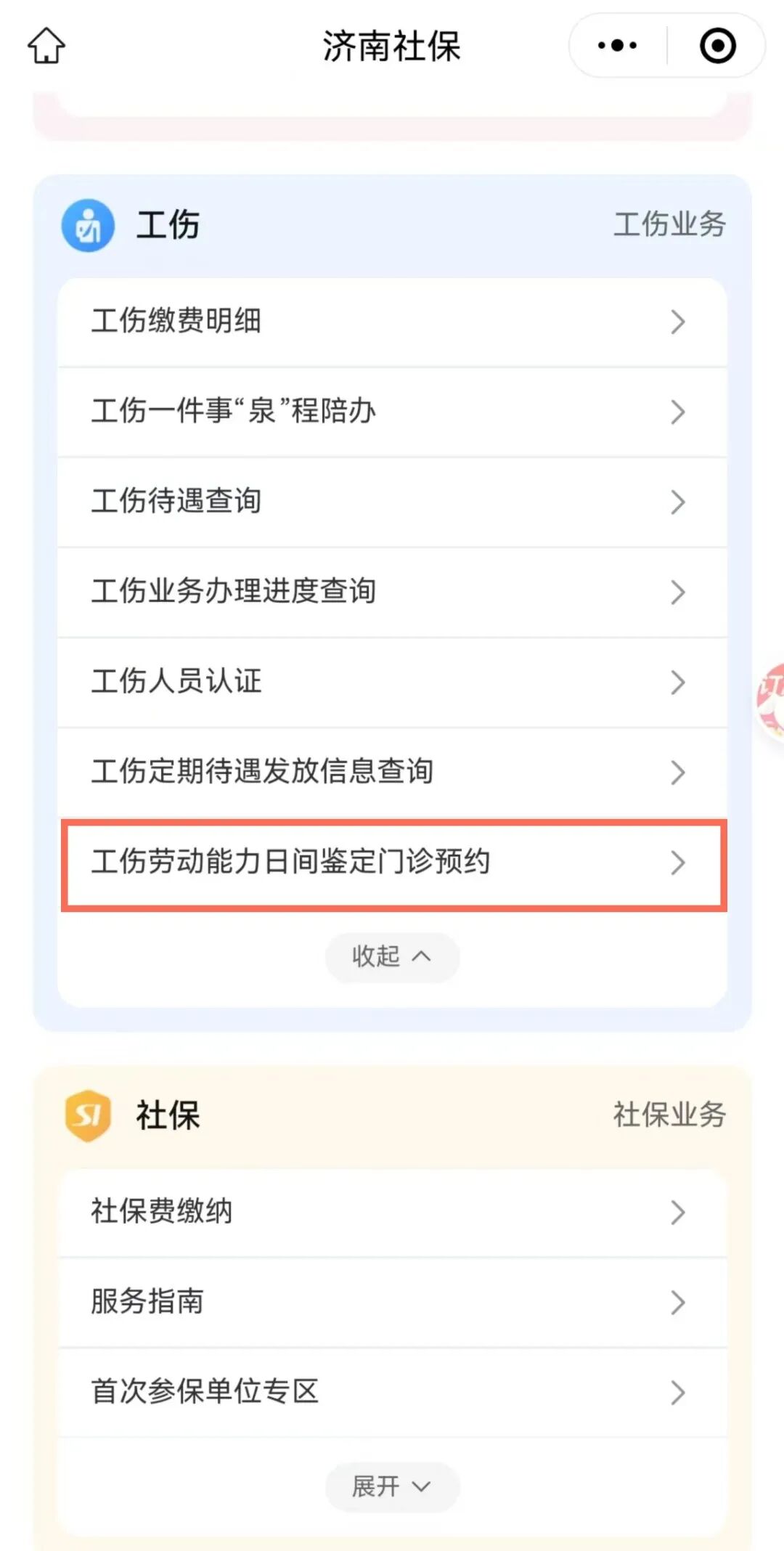 “济南社保”微信公众号预约流程: 1、点击公众号菜单栏“办社保”,选择“工伤”板块下的“工伤劳动能力日间鉴定门诊预约”: (点击图片可放大查看) 2、选择“我要预约”,进入后仔细阅读页面内容: (点击图片可放大查看) 3、选择预约日期及时间: (点击图片可放大查看) 4、核对信息无误后,点击提交: 5、预约成功后,查询预约情况: