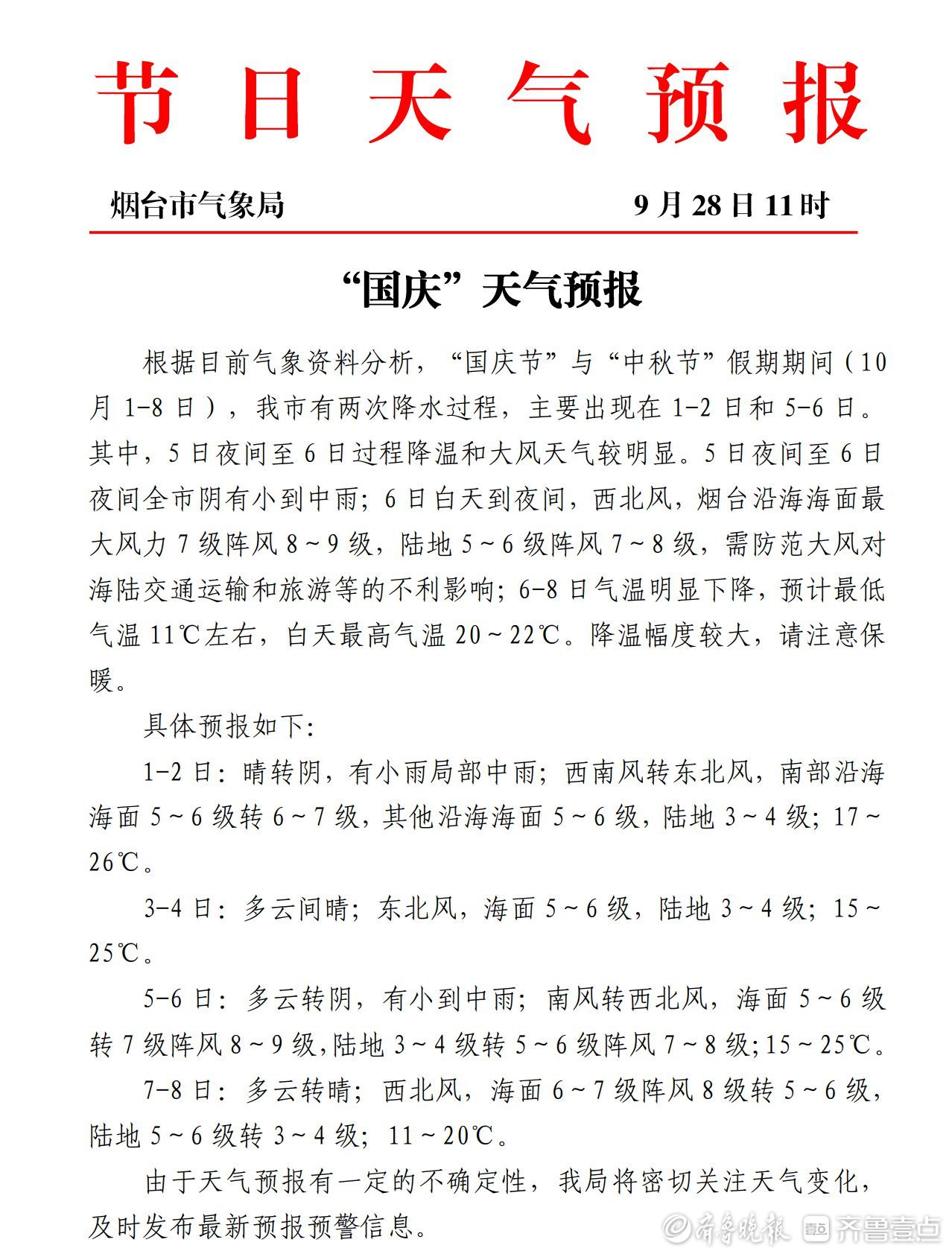 9月28日11时,烟台市气象局发布节日天气预报,根据目前气象资料分析,“国庆节”与“中秋节”假期(10月1—8日),烟台市有两次降水过程,主要出现在1—2日和5—6日。其中,5日夜间至6日过程降温和大风天气较明显。5日夜间至6日夜间全市阴有小到中雨;6日白天到夜间,西北风,烟台沿海海面最大风力7级阵风8~9级,陆地5~6级阵风7~8级,需防范大风对海陆交通运输和旅游等的不利影响;6—8日气温明显下降,预计最低气温11℃左右,白天最高气温20~22℃。降温幅度较大,请注意保暖。