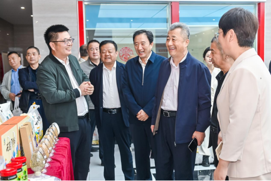 巡展环节,参会领导与嘉宾一同前往特色农产品展示展销区,各类优质农产品整齐陈列,从一镇一品,到本地特色农产品,应有尽有。清脆爽口的曲堤黄瓜、香甜多汁的本地水果、独特风味的农产品,黄瓜汁、黄瓜酱菜等多彩多样的深加工产品,让大家赞不绝口。
