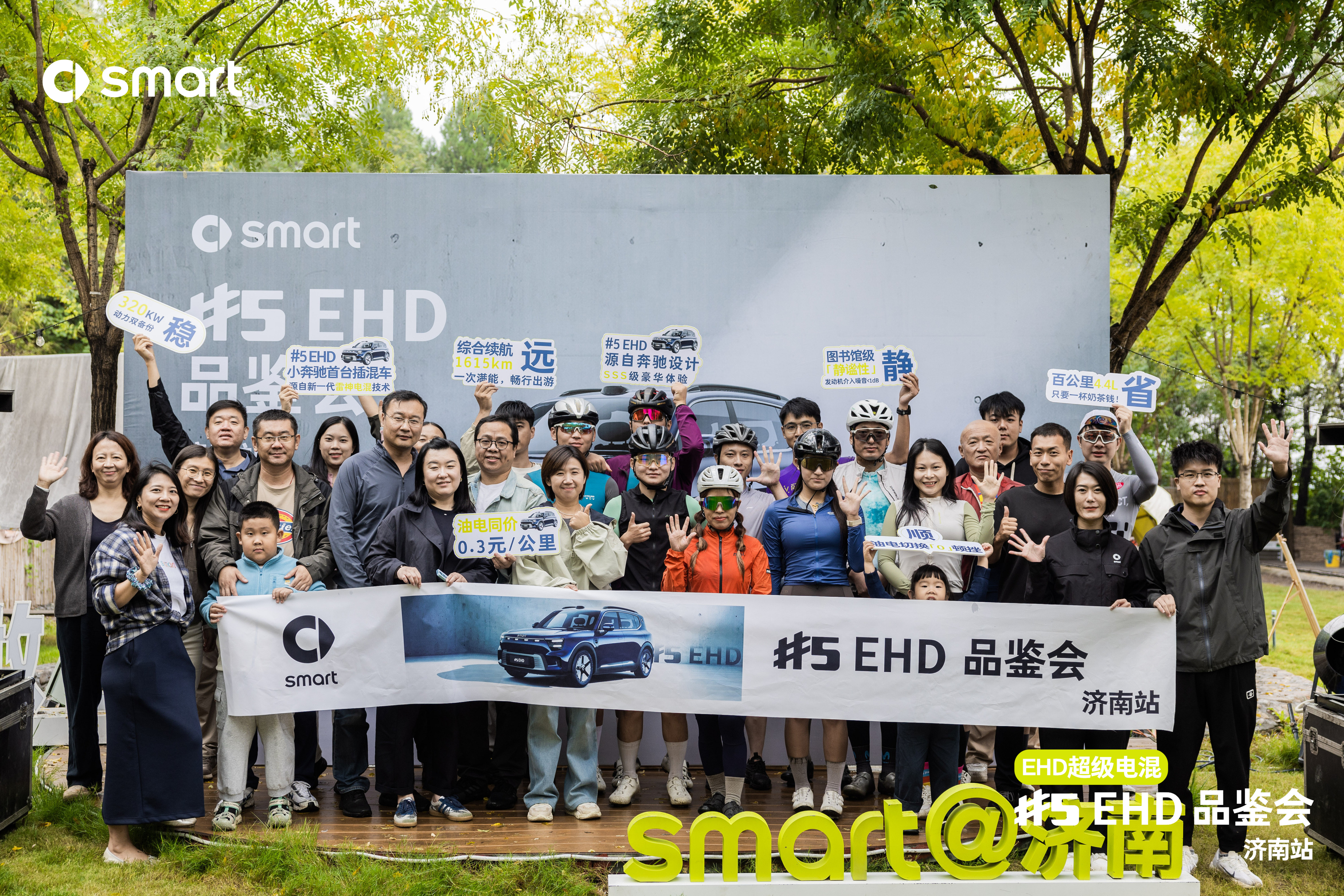 活动当日上午8:00,TREK自由骑行车友们从smart济南经十东路店活力出发,开启了38公里的骑行之旅,最终顺利抵达济南卧虎山景区露营地。而早已等候在此的smart“密友”们,以热情的握手和合影留念,表达对骑行者的欢迎。大家完成现场签到领取抽签码,直至活动开场,smart领导石总亲临现场,为活动致开场辞,表达了对到场嘉宾的热烈欢迎和对smart品牌发展的展望。随后,smart领导林总也针对本次活动发表致辞,分享了smart#5EHD超级电混的研发理念和市场前景。