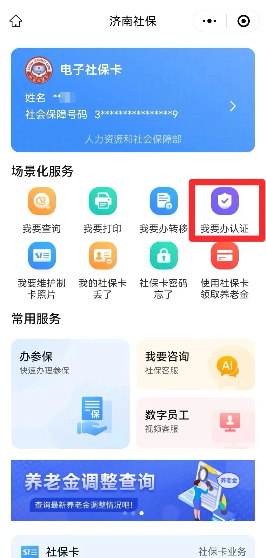 或在微信搜索“济南社保”公众号,点击下方“办社保”,找到“我要办认证”按键,进入认证界面后点击“本人认证”,按提示进行人脸识别认证即可。