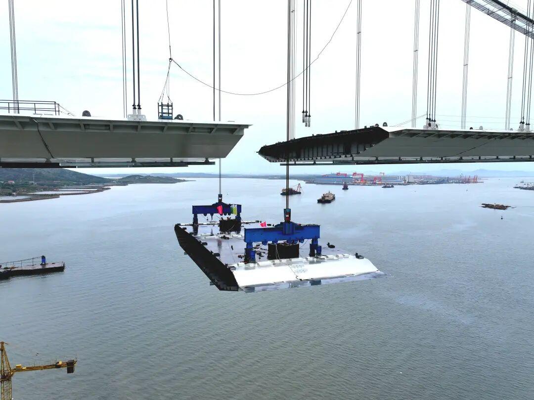 该项目钢箱梁吊装中跨采用缆载吊机垂直吊装,边跨采用液压提升系统多次连续接力荡移结合滑移支架的复杂工艺。钢箱梁荡移施工难度极大,共计30榀钢箱梁需进行荡移施工,总荡移次数达64次。该工艺施工周期长、技术难度高,且对天气条件极为敏感,严重制约工程进度,在省、威海和乳山市以及各参建单位的共同努力下,项目克服重重困难,顺利完成合龙。