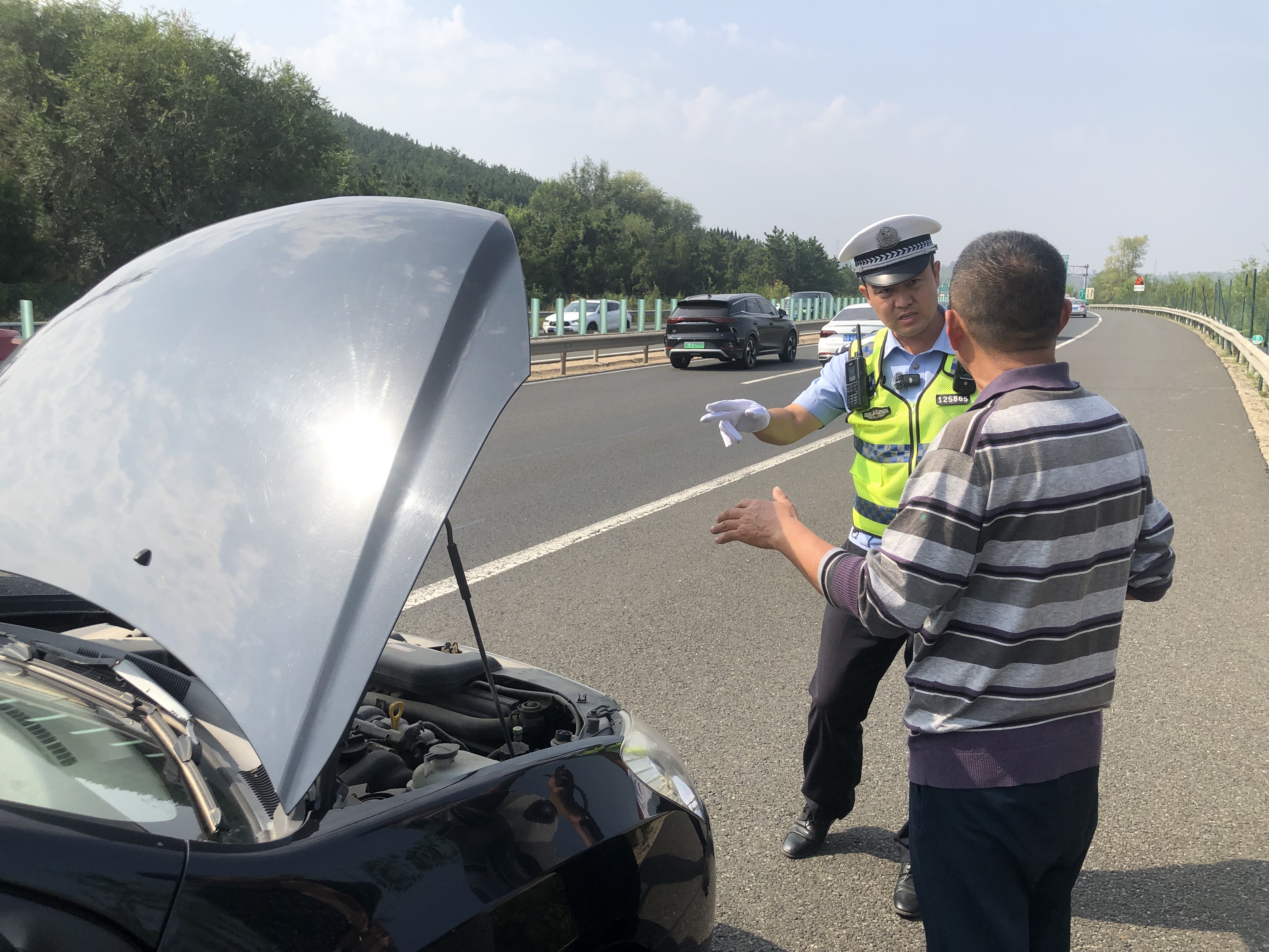 100多米外,一辆黑色轿车瘫在应急车道上。车主吴先生焦急地说:“车坏了,突然挂不上挡了。”张相英上车尝试后,一边安抚车主,一边协调拖车救援——这只是他在岗期间处理的众多突发状况之一。