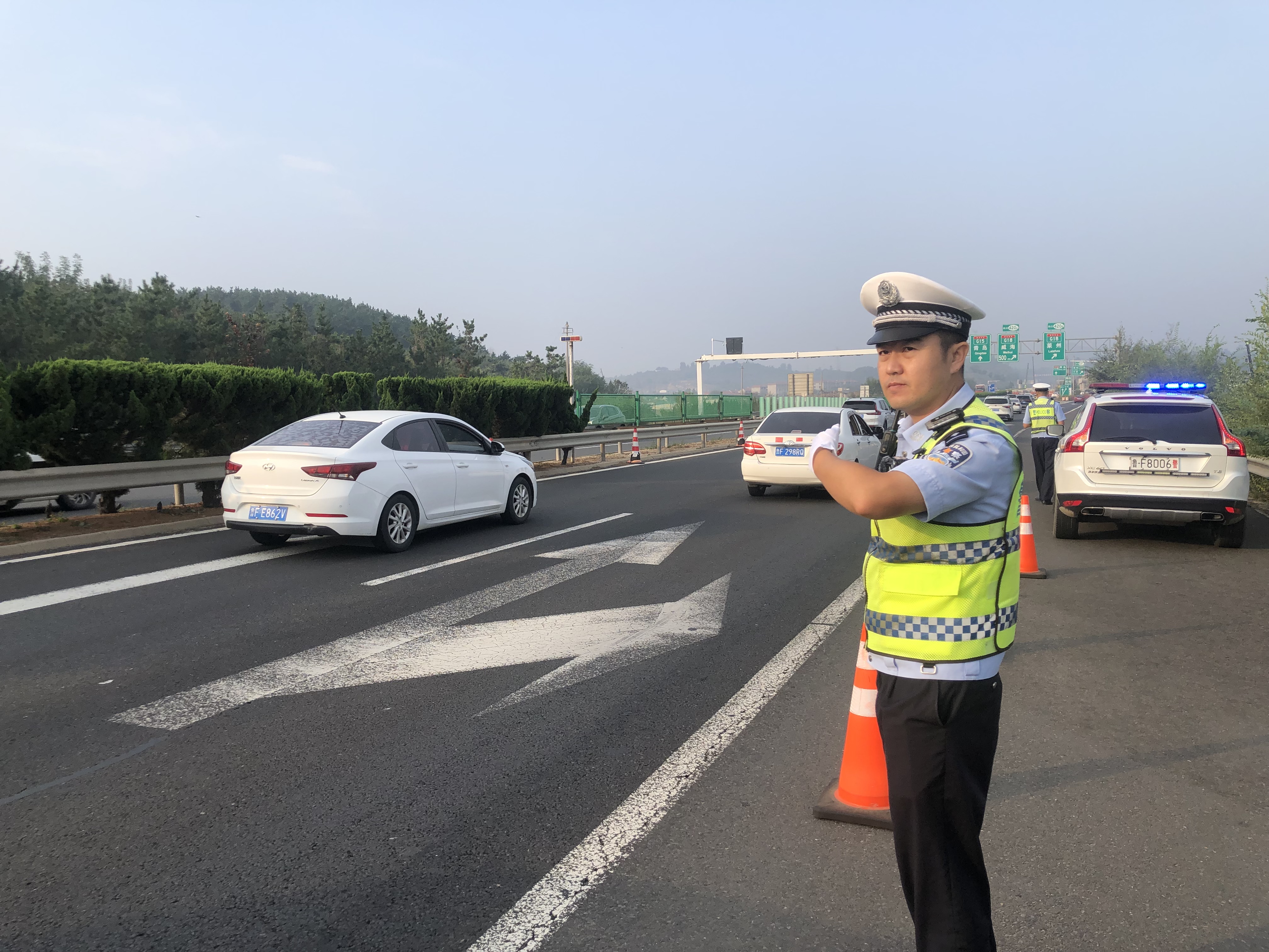 紧接着,他来到沈海高速大杨家立交桥执勤点位疏导交通。“不要跟车太近,保持车距。不要随意变道…… ”张相英通过扩音器,提醒驾车员注意安全。他的眼神里有疲惫,但更多的是专注。