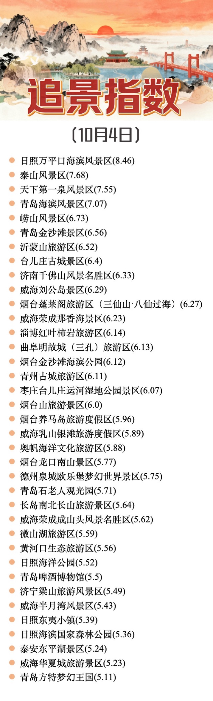 “国庆假期追景指数”显示,10月4日,山东40个热点景区的“追景指数”均值为5.97,较上一日上升0.84%。排名前3位的分别是日照万平口海滨风景区、泰山风景区、天下第一泉风景区,“追景指数”分值分别为8.46、7.68、7.55。