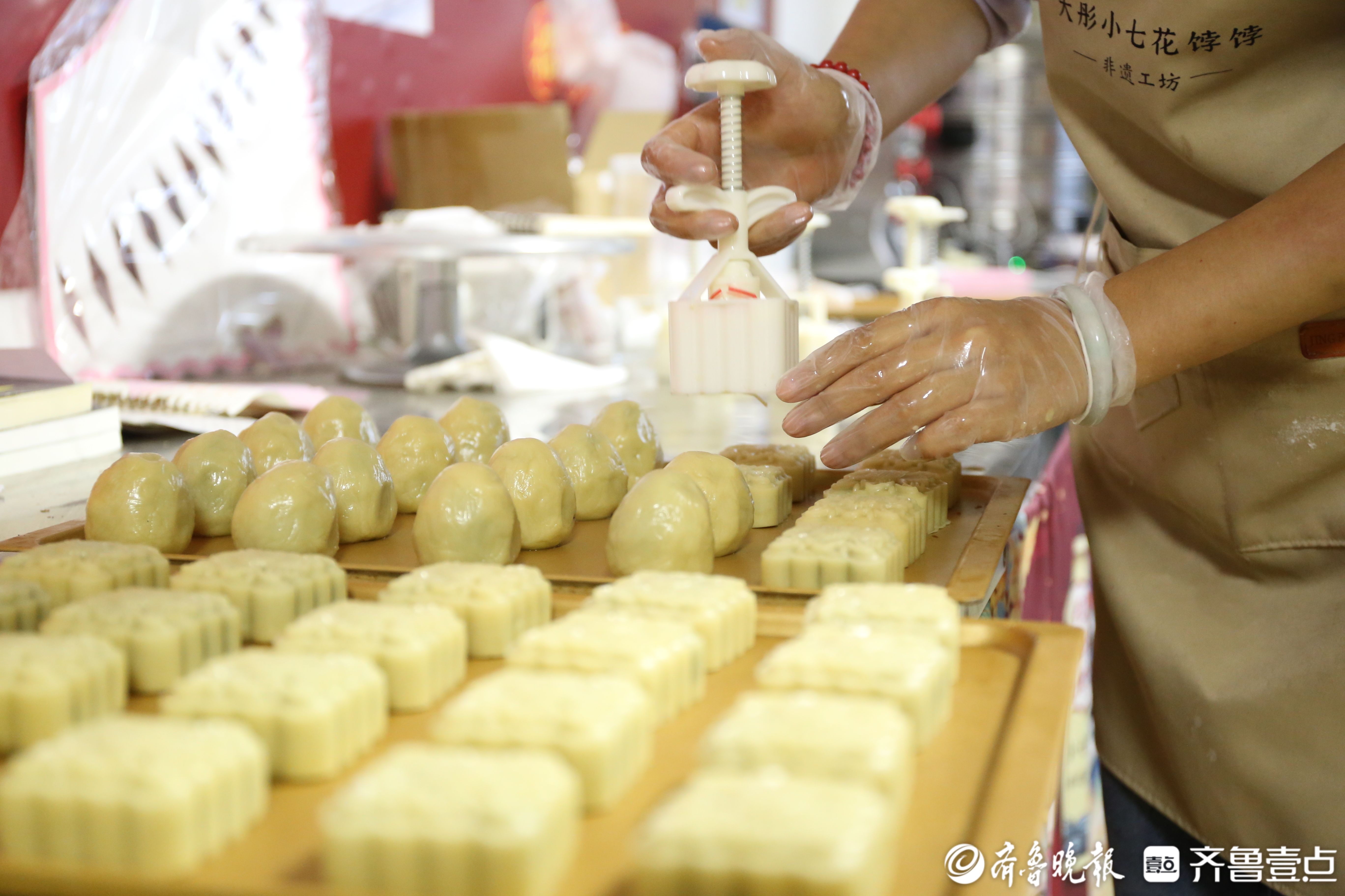 近日,位于日照市东港区的某花饽饽非遗工坊,工坊创始人袁霞忙里偷闲舒展了一下酸痛的腰和肩膀。连续多日的忙碌,让她眼底带着一丝疲惫,但手上的动作却丝毫没有停歇,依旧专注地在加工台上调配月饼面料与馅料。“现在手里还压着300多箱订单,每天都得忙到凌晨两三点才能下班。”