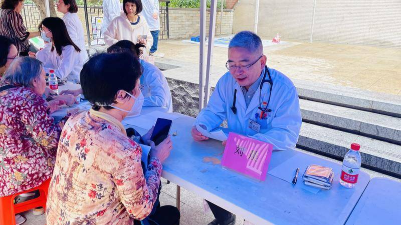 广州市第一人民医院心血管内科主任医师刘震(右一)为居民进行义诊。新华社发