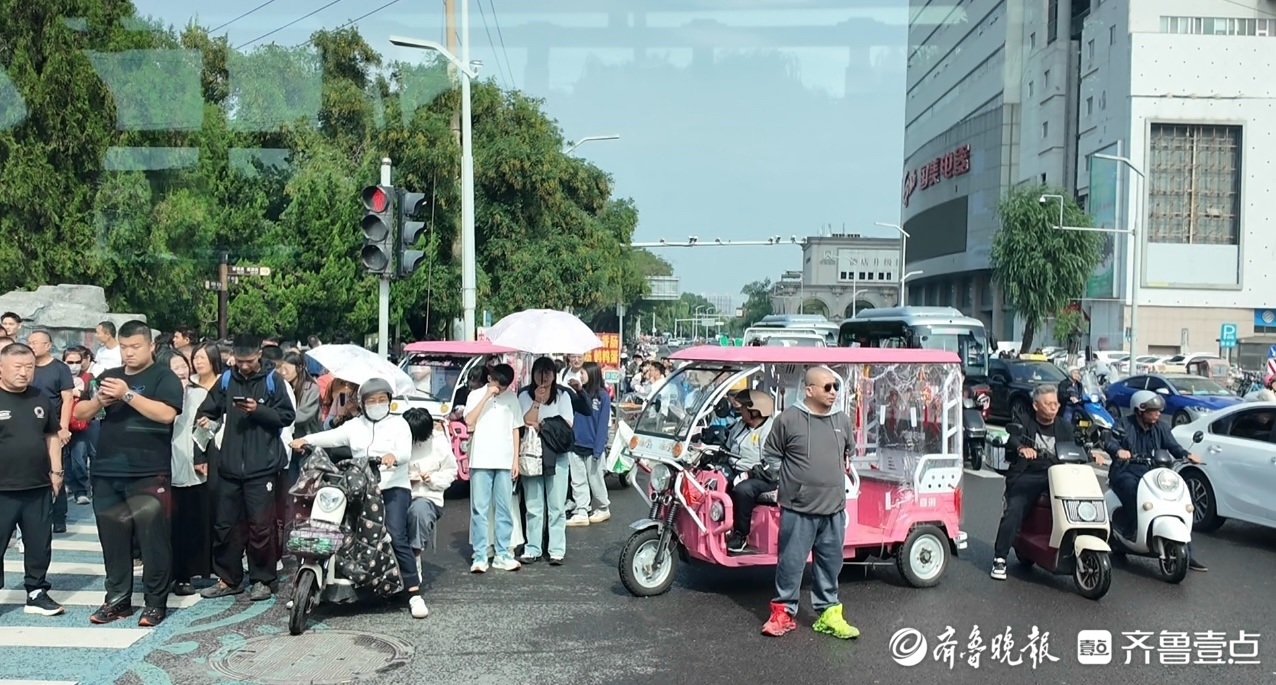 “虽然要价确实有点多,但坐花车很方便,我们从景区出来,直接就能去下一个景点。” 来自淄博的游客陈锋和家人刚从一辆花车上下来,他坦言,景区周边打车难、道路拥堵是常态,而等公交车不仅要多走一段路到站点,还得花费不少等待时间,权衡之下才选择了花车。