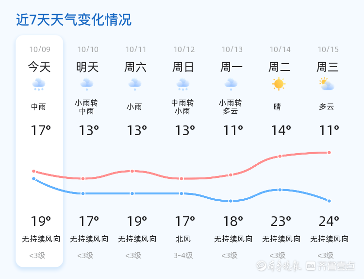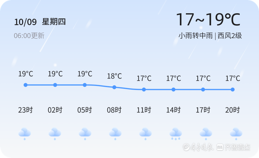 今天是10月9日,星期四,农历八月十八。济南市迎来降雨天气,全市各区普遍出现小雨转中雨的天气情况。目前气温为14.5℃,伴有西风2级,空气湿度达到98%,PM2.5指数为13,空气质量良好。预计今天最高气温为19℃,最低气温为17℃。各区天气情况基本一致,市民出行需携带雨具,注意交通安全。