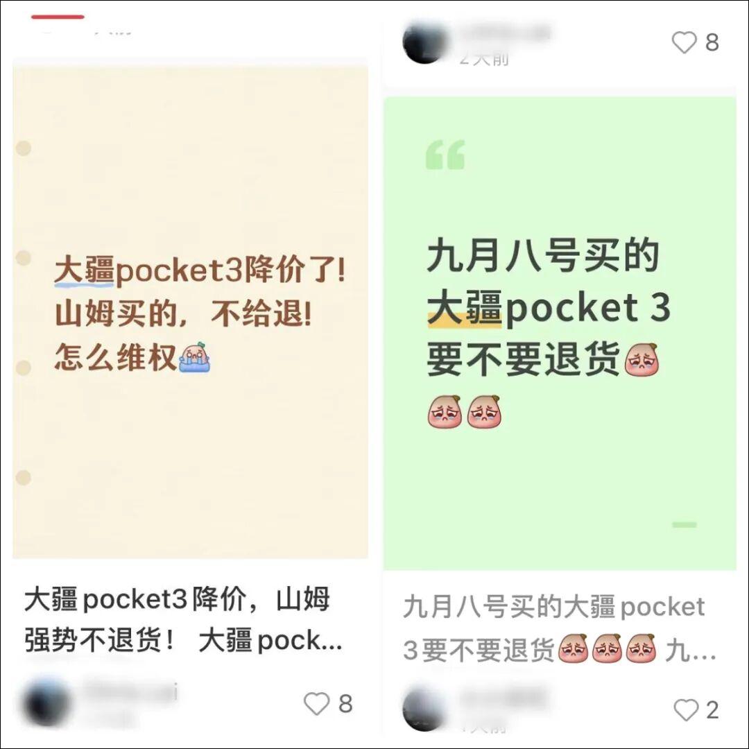 有用户向记者反馈,她已同大疆线下授权店的店员协商好,她9月下旬在该门店购买的产品,该门店会按照产品原价和优惠价格之间的差价提供补偿方案,包括补配件和补差价两种选择,她已选择了补配件方案。她发了帖子后与其他网友沟通,了解到也有网友拿到了线下门店的补偿。她认为,大疆此次降价引发一些用户不满,一个原因是线上渠道购买有7天价保等政策,但一些线下渠道没有,此外,大疆产品出新或降价有时缺乏固定的周期预告,导致消费者无法根据预告提前做好购买规划。另外,据极目新闻报道,一位网友告诉记者,她是10月3日原价购买的Pocket3相机,得知降价的消息后心情低落,“早知道先不买了。”