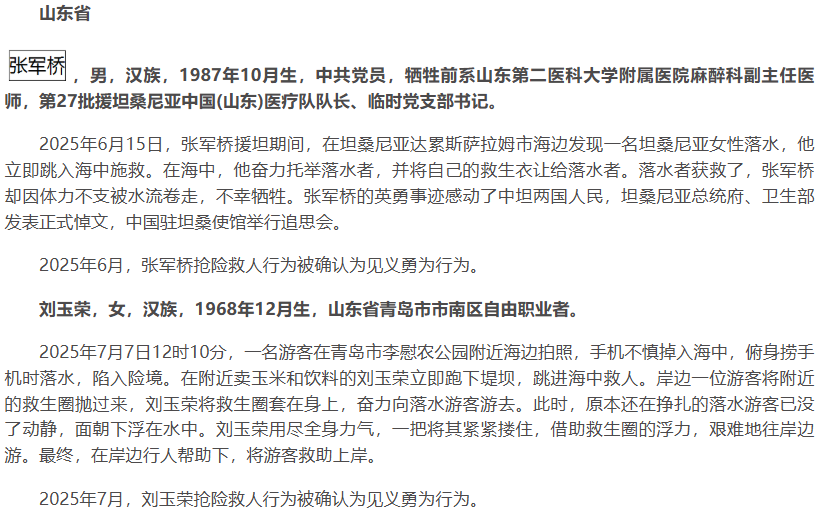 2025年第二、三季度见义勇为勇士榜中,山东张军桥、刘玉荣上榜。