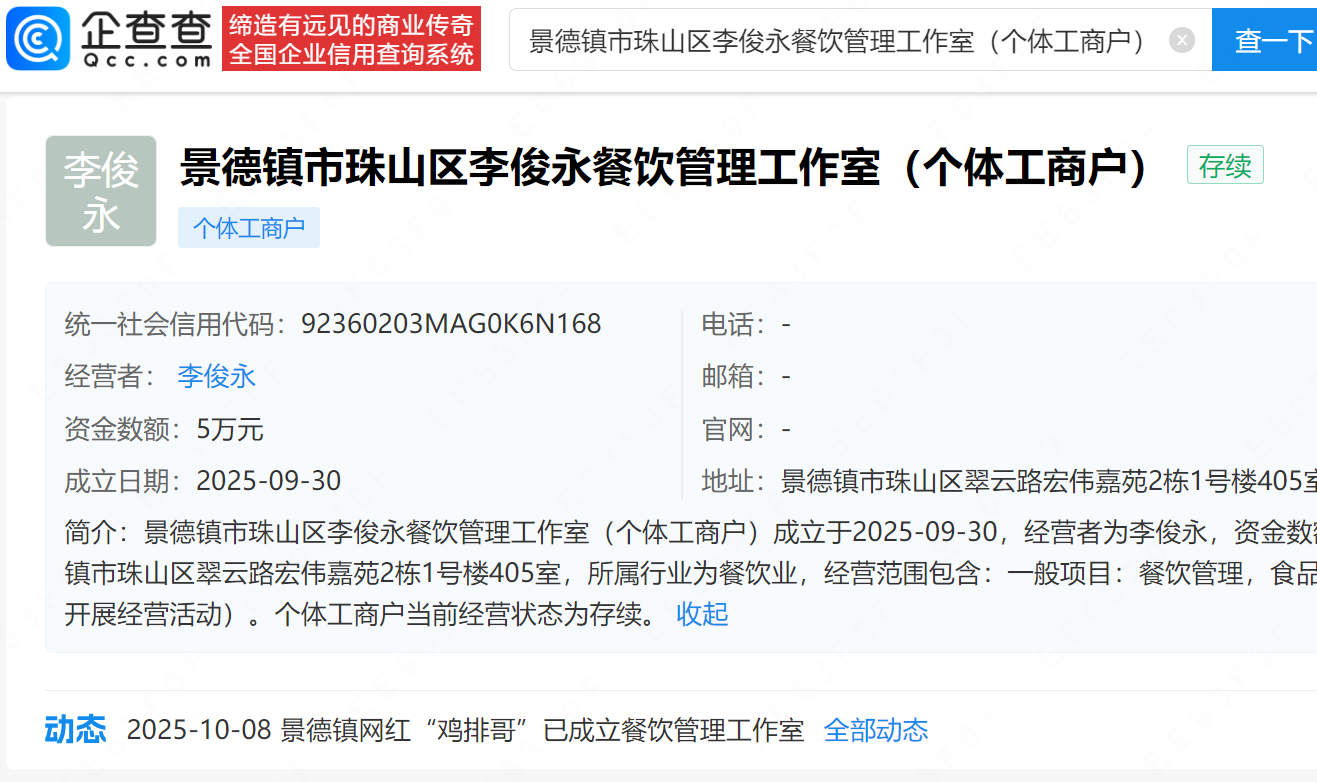 企查查APP显示,9月30日,景德镇市珠山区李俊永餐饮管理工作室(个体工商户)成立,经营者为李俊永(鸡排哥),资金数额5万元,经营范围包含餐饮管理、食品销售。第三方数据显示,鸡排哥视频平台粉丝数已超94万,其中国庆8天假期涨粉超40万。商业化水平显示,其1-20s、21-60s、60s以上视频广告报价均为10元。