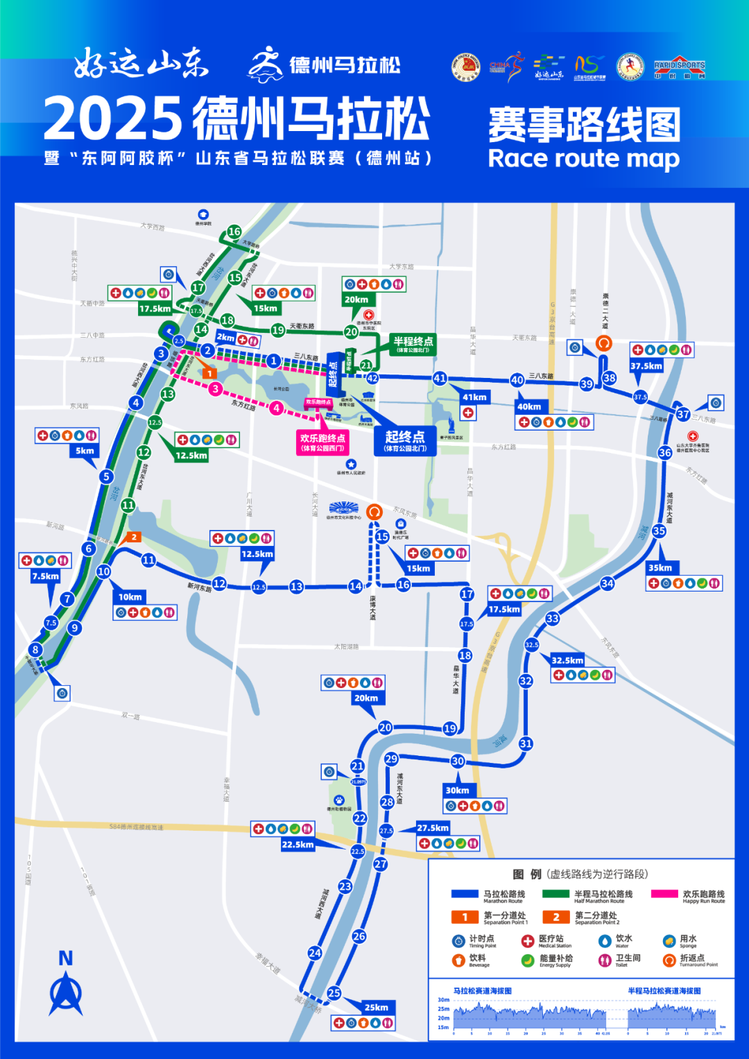 三八东路(体育公园北门)→三八路桥(向西跑进)→右转至三八路岔河桥西北侧匝道(向北跑进)→下匝道后右转至岔河西大道(向南跑进)→左转至岔河西堤顶路(向南跑进)→左转至解放南大道于官屯大桥(向东逆向跑进)→左转至岔河东堤顶路(向北跑进)→右转至天河路(向东跑进)→左转至岔河东大道(向北跑进)→右转至新河路桥南侧匝道(向东跑进)→右转至新河东路(向东跑进)→左转至康博大道西半幅(向北逆向跑进)→折返幸福玫瑰园西门东半幅(向南逆向跑进)→左转至新河东路(向东跑进)→右转至晶华大道(向南跑进)→右转至减河西大道(向西跑进)→左转至幸福大道减河桥(向东逆向跑进)→左转至减河东大道(向北跑进)→右转至三八东路减河桥(向东跑进)→右转至三八东路(向西跑进)→右转至崇德二大道(向北跑进)→山东兆维电缆门口折返(向南跑进)→右转至三八东路(向西跑进)→直行至三八东路与康博大道路口(逆向至马拉松终点拱门冲线)