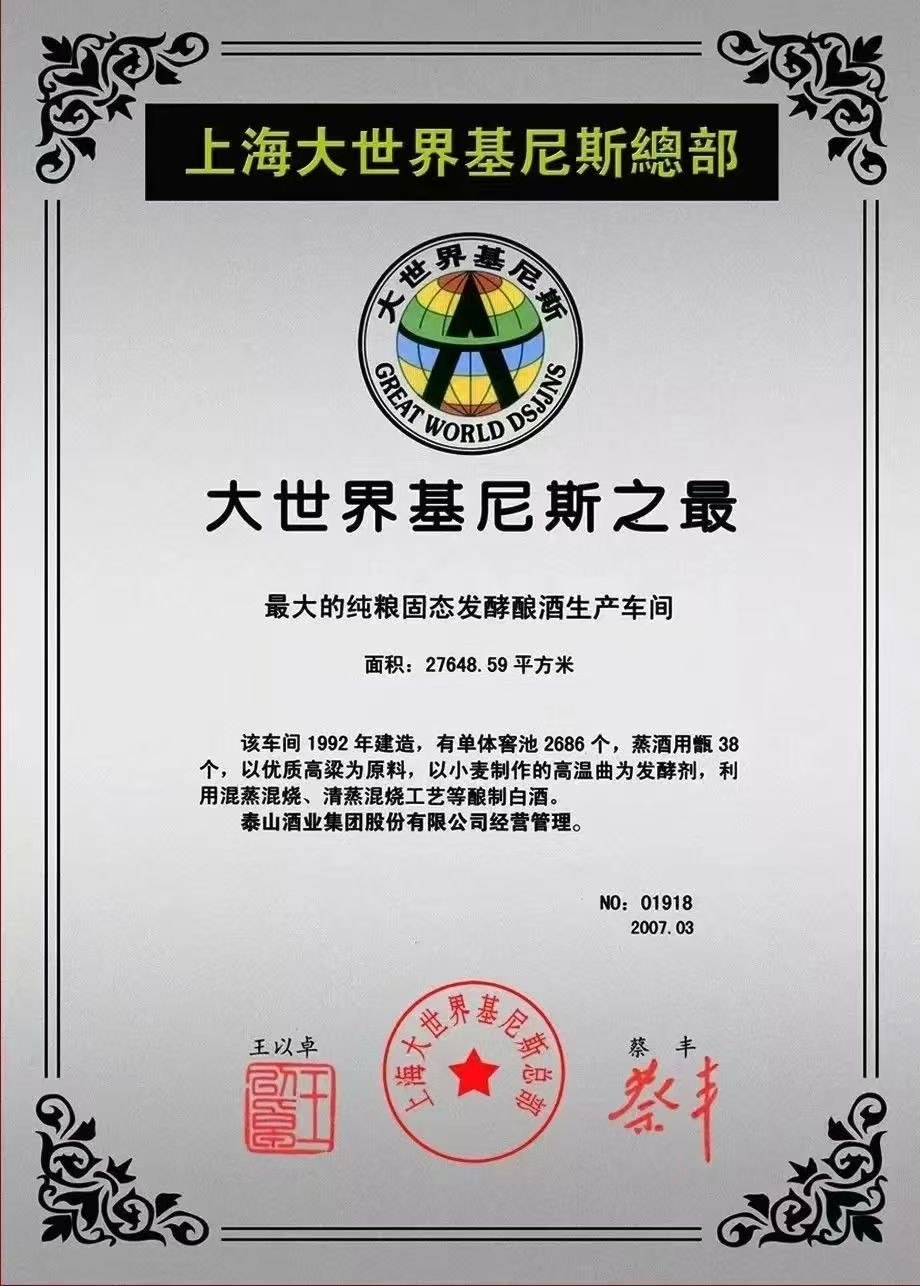 为何是“小窖”?这背后蕴藏着深刻的酿造智慧。全国著名白酒专家沈怡方曾高度评价:“泰山酒业5立方米的‘小窖’在全国是独一无二的,是名副其实的创新。”与大型窖池相比,金条小窖的表面积与容积之比接近3:1,大大增加了产香窖泥和酒醅的接触面积,使酒醅能与窖泥中的微生物群进行更充分、更剧烈的交换与反应。庞大的微生物群落在此繁衍生息,最终赋予了泰山酒“窖香纯正、多粮香浓郁、酒体醇厚、尾净味长”的典型风格。方寸之间,实则是波澜壮阔的生化反应世界,是自然之力与人类智慧共同书写的酿造奇迹。这奇迹的背后,离不开一代代泰酒人的匠心守护与远见卓识。1992年,泰山酒业投资两亿元,在全国酿酒专家指导下,精心建成了拥有3000座小窖池的粮食酒生产车间,荣登“大世界基尼斯之最”。在当时,泰山酒业毅然摒弃造价较低、更方便机械化操作的大窖池,坚守古法小窖酿造。正如张铭新董事长所说:“小窖虽然建窖和维护成本高,但生产出来的酒质量更好。”这种以质量为根本的长期主义,正是泰山酒浓柔风格的根基。