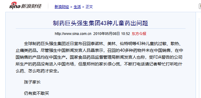 强生公司曾多次召回其生产的药品,其中包括儿童用药。2010年强生公司因未在药瓶正面的标签上注明药品中含有微量酒精成分,宣布召回逾900万瓶泰诺(Tylenol)感冒药。
