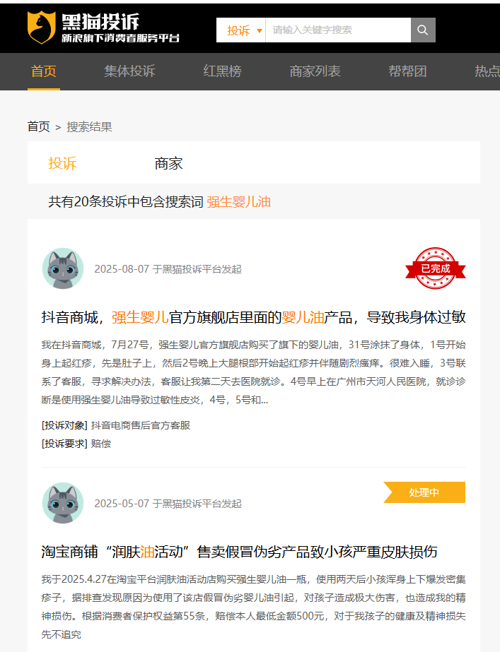 黑猫投诉平台关于强生婴儿油的投诉有20条,多数问题是通过网络平台购买的强生婴儿油使用后导致过敏,皮肤出现损伤。