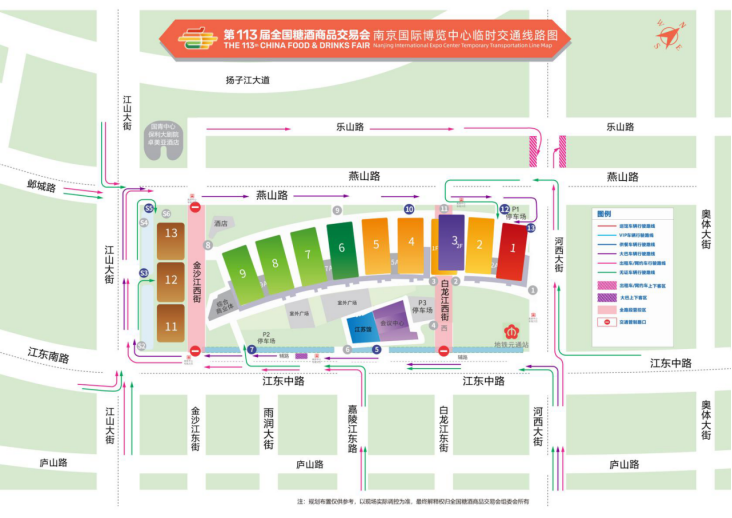 1. 为确保您安全、便捷到达展会现场,请提前关注南京市地铁集团发布的相关信息,优先选择公共交通到达展馆。