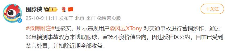 10月9日,据@围脖侠 :经核实,用户@风云XTony 对交通事故进行营销炒作,通过恶意揣测事故双方来博取眼球,宣扬不良价值导向,因违反社区公约,目前已受到禁言处置,并扣除近期全部收益。