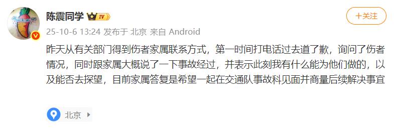 记者注意到,10月5日,另一位事故当事人的家属发声,称有两个孩子、四个老人需要照顾,现在又多了一个多处骨折的老公。随后,陈震转发这条微博道歉。目前,当事人家属的这条微博已被删除,其账号也显示已自行申请关闭。
