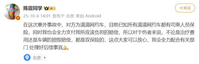10月6日,针对3日发生的北京万寿路交通事故,陈震再次发声: