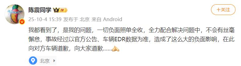 “我都看到了,是我的问题,一切负面照单全收,全力配合解决问题中,不会有丝毫懈怠,事故经过以官方公告、车辆EDR数据为准,造成了这么大的负面影响,在此向对方车辆道歉,向大家道歉。”