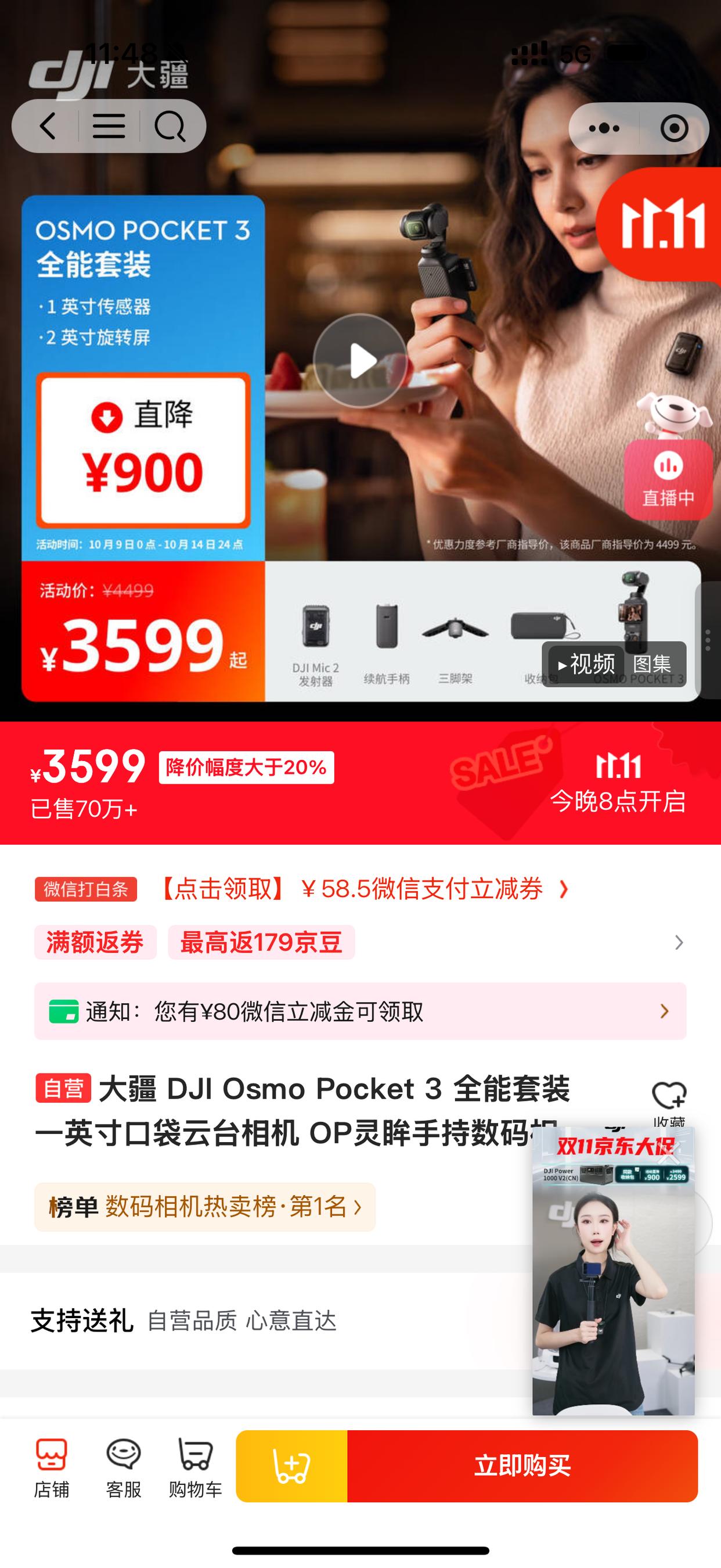 记者注意到,截至发稿,大疆的京东旗舰店直播间显示,云台相机Pocket 3最高降价900元可立即购买,降价700元的标准套装需预约,9日15:00至15:05抢购。Mini 4 PRo无人机降1478元,可直接购买。