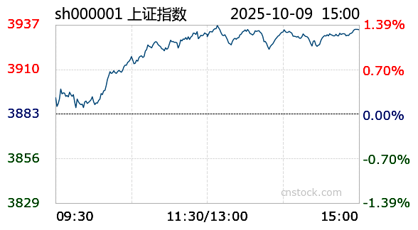 AI小壹10月9日讯 沪市小幅上涨,最高触及3936.58点,最低下探3885.74点,振幅1.32%。截至今日15:00收盘,上证指数报3933.97点,涨幅1.32%,成交额1.22千亿元,成交量7.25亿;深证成指报13725.56点,最高13806.69点,最低13565.29点,涨幅1.47%,成交额1.44千亿元,成交量7.97亿;创业板报3261.82点,最高3322.44点,最低3243.71点,涨幅0.73%,成交额6582.1亿元,成交量2.37亿。