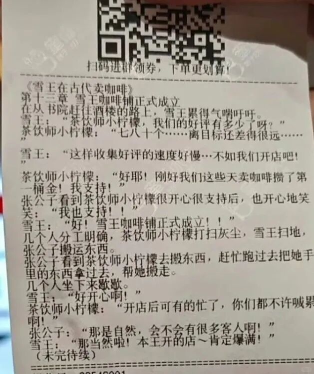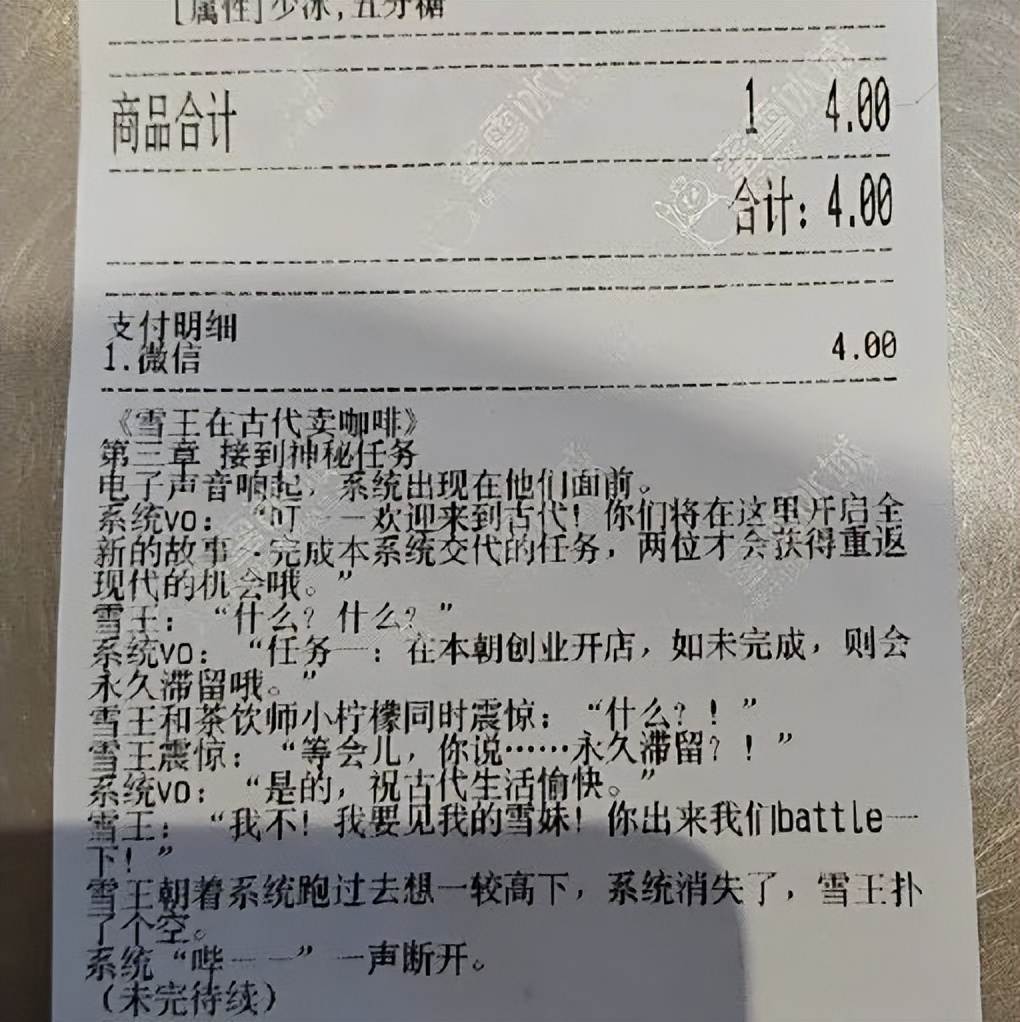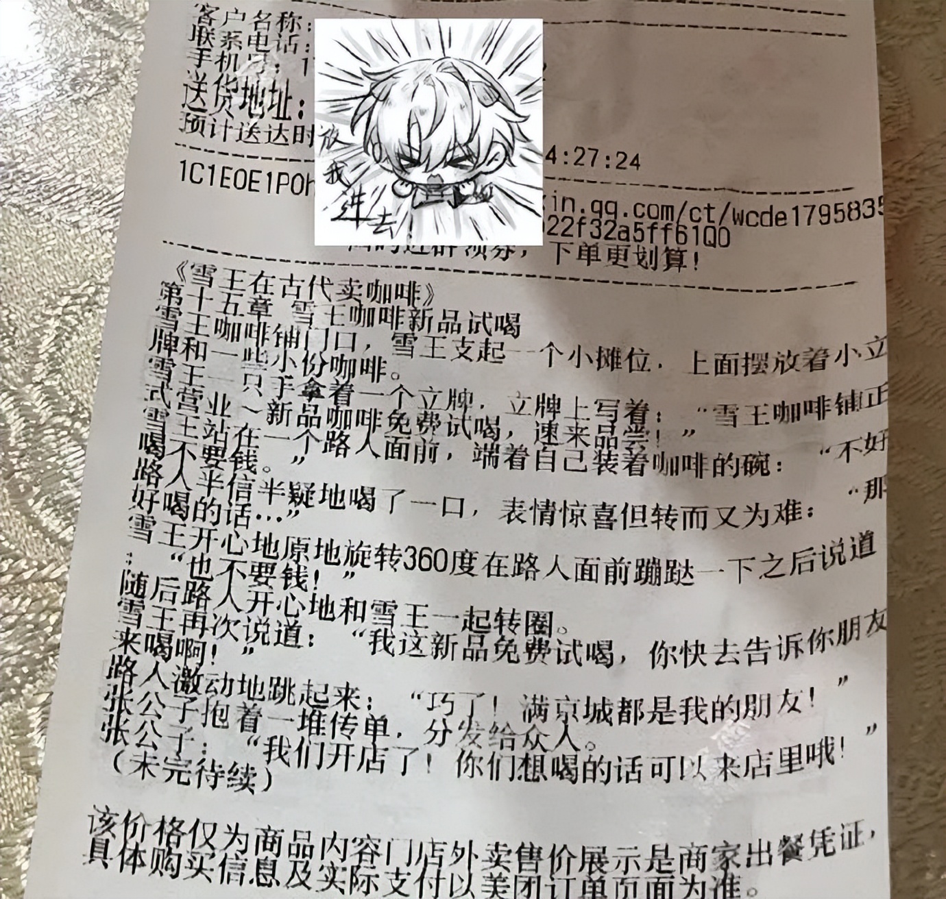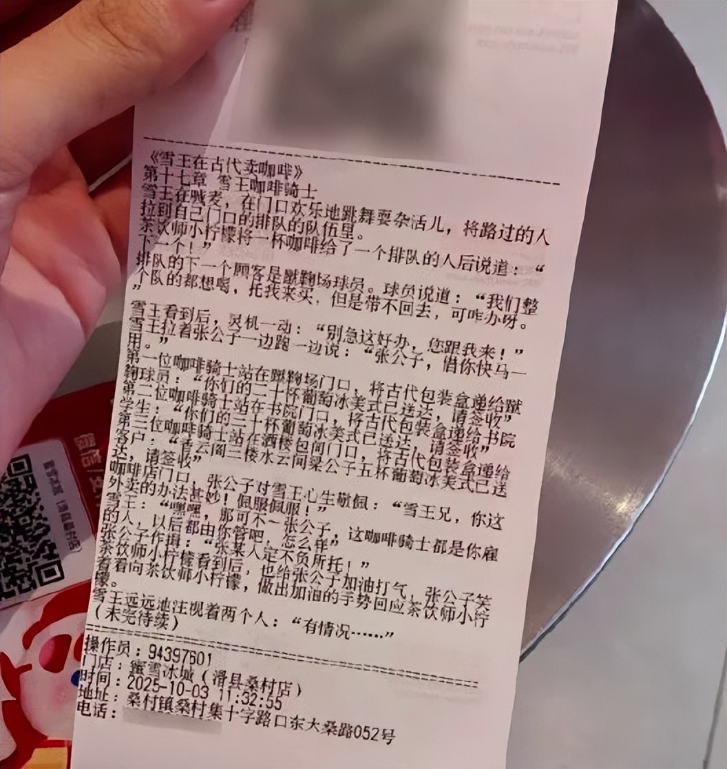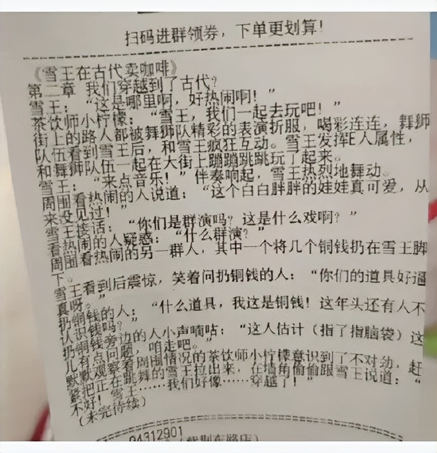近日,有网友在社交平台发帖称,其在购买蜜雪冰城时发现小票上印有连载小说,讲述了“雪王”与伙伴小柠檬穿越至古代经营咖啡店的故事,随后相关话题引发热议。