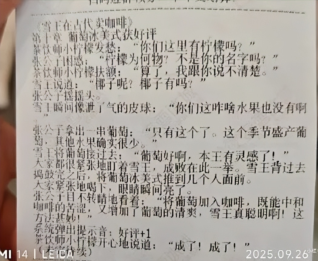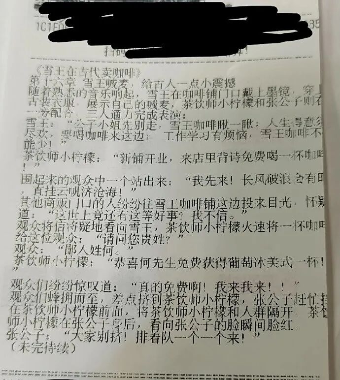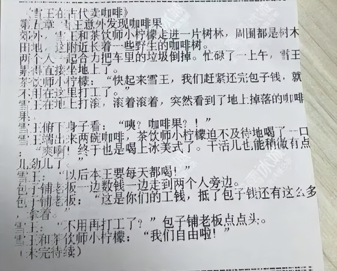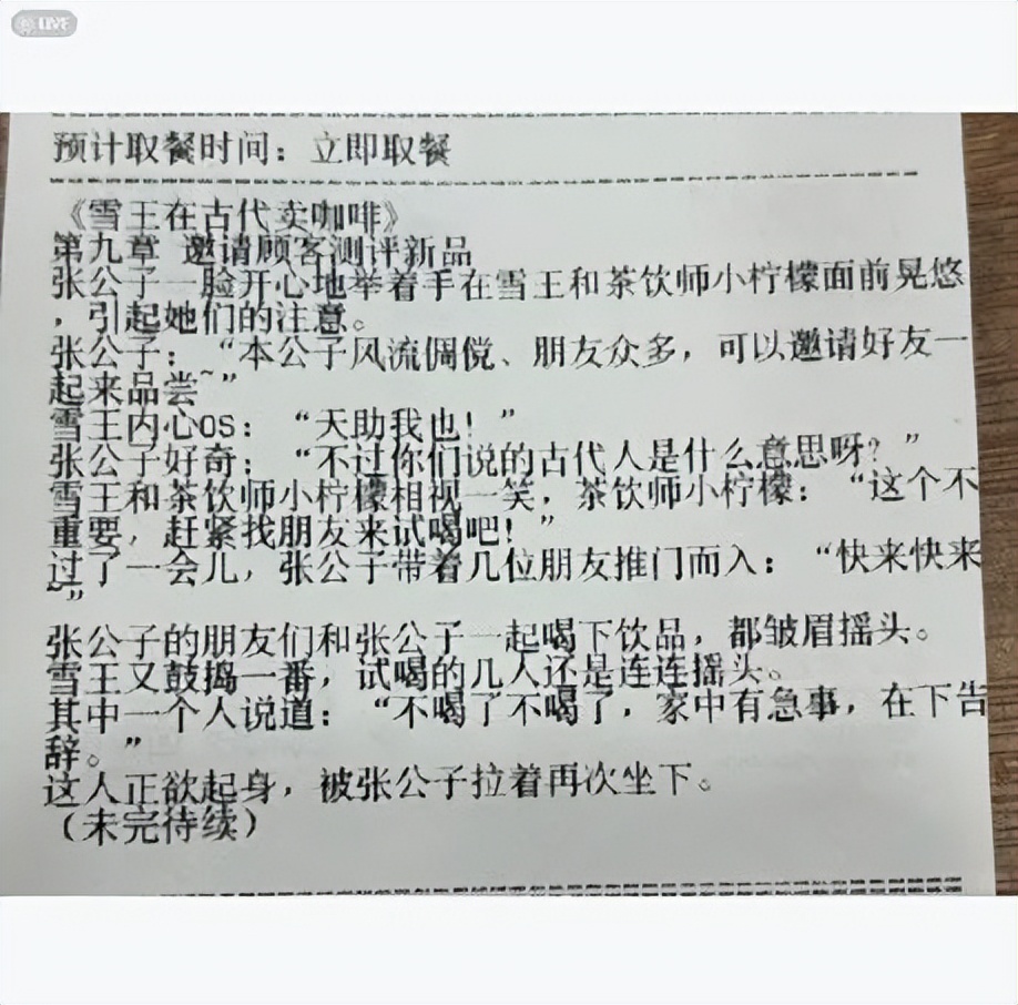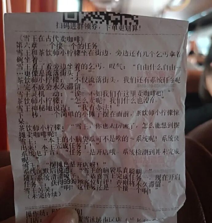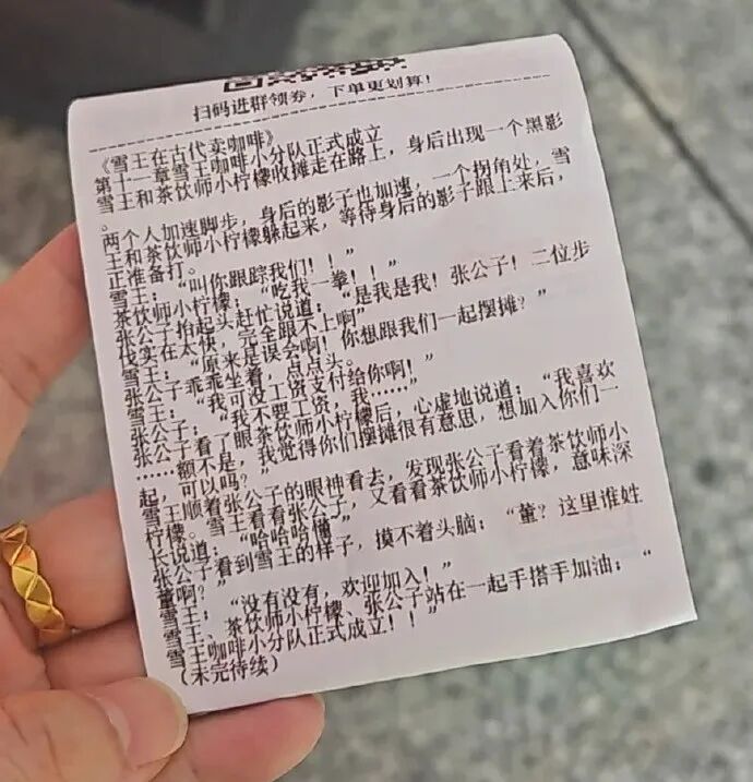 近日,有网友在社交平台发帖称,其在购买蜜雪冰城时发现小票上印有连载小说,讲述了“雪王”与伙伴小柠檬穿越至古代经营咖啡店的故事,随后相关话题引发热议。