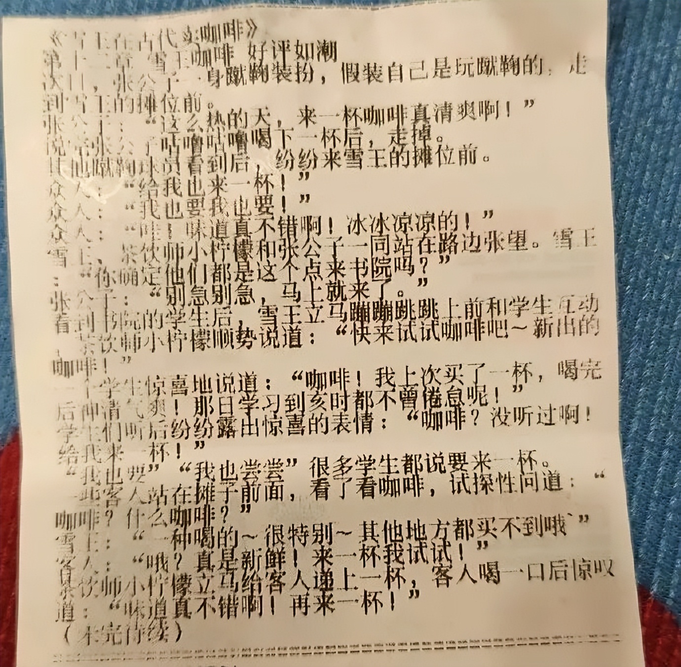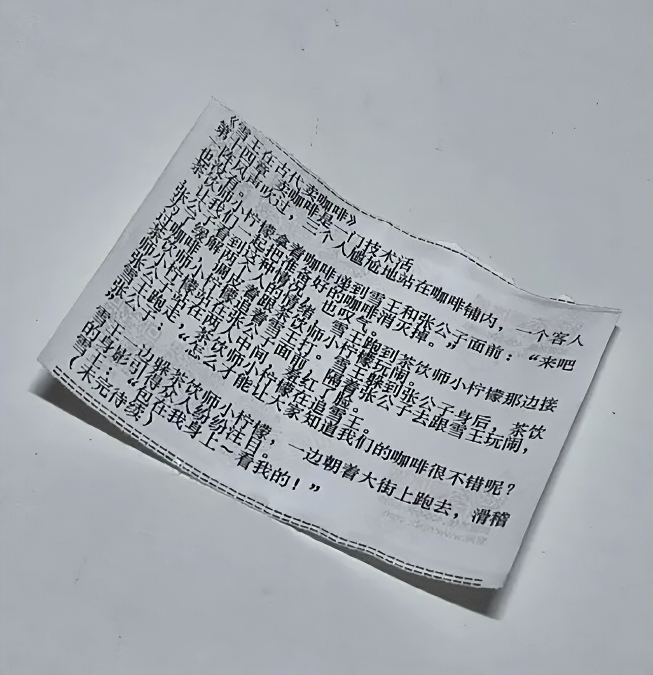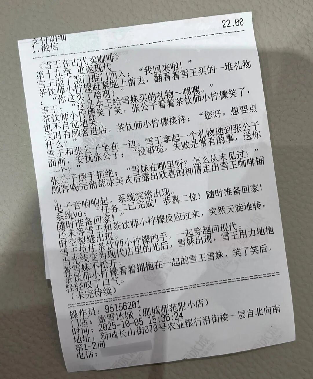记者以消费者身份咨询多家蜜雪冰城门店。有工作人员表示,小票上印小说是公司行为,从9月开始陆续推出,章节随机发放,线下购买每张小票基本都会附带。该工作人员还介绍,每次节假日小票上都会印一些祝福语,最近这一个月才有这样的小票。