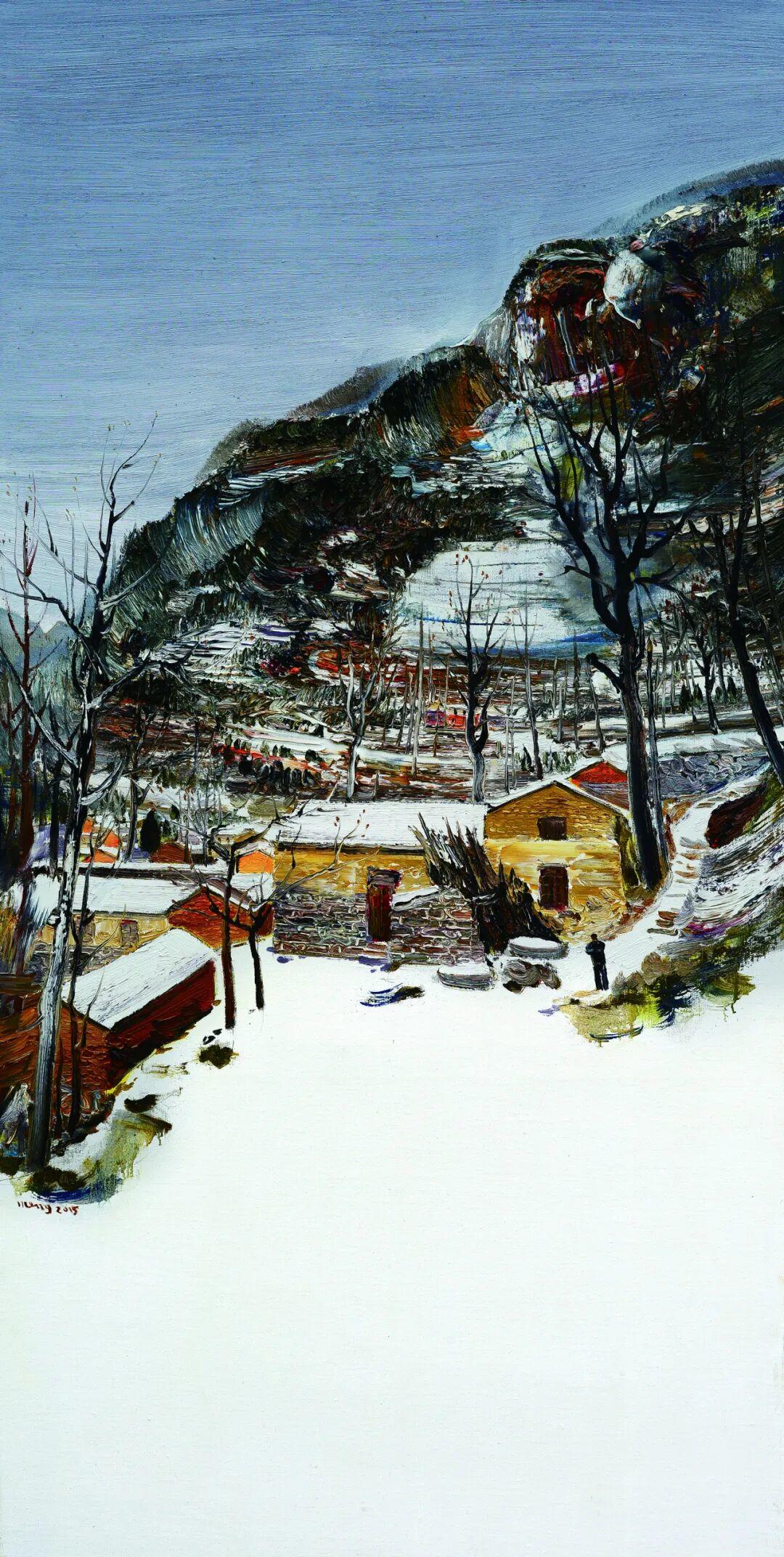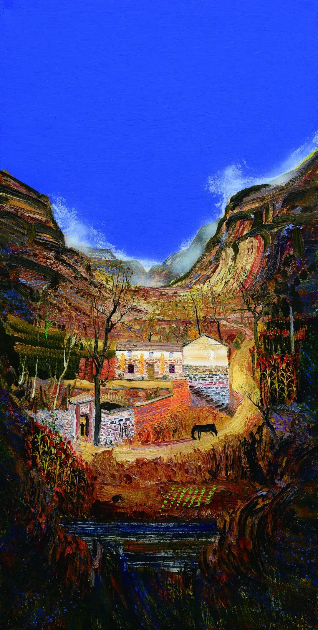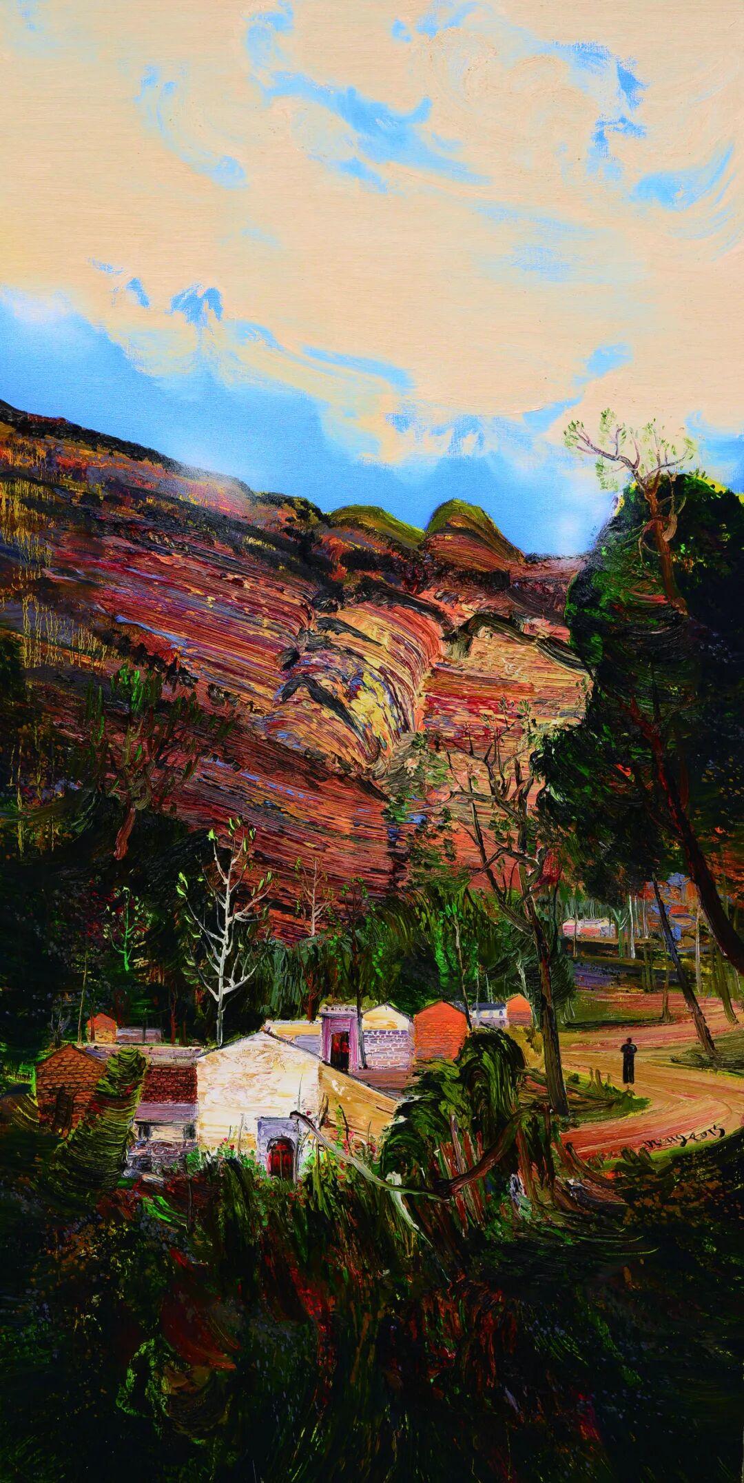 在孟新宇的绘画语言中,肌理的塑造拥有不亚于色彩的独立价值。他毫不掩饰甚至极力强调颜料的物质性,使绘画的行为本身“显影”于画布之上。画家娴熟地使用调色刀作为其主要“笔具”,丰富的刀法构成了肌理语言,时而用刀锋刮擦,时而用刀面拖拽。最显著的是,他大量采用直接堆砌的方法,将浓郁黏稠的颜料用刀挑起,按压、堆积在画布上,形成地质构造般粗粝、坚硬、极具实体感的浮雕式效果。在山体的表现上,这种厚重的堆砌模拟了岩石的质感,而在表现植被时,又转化为密集、短促的点状肌理。这种对肌理的极致追求,使画面获得了一种强烈的触觉感召——观者即便无法真正用手触摸,通过目光也仿佛能感受到那些凹凸起伏的质地变化,体验到“视觉的触感”。笔触与刀痕从不是描绘物象的从属手段,本身就是被凝视、被欣赏的主体,它们忠实地记录着画家的手势、动作、力量,构成了关于绘画本身的纯粹叙事。