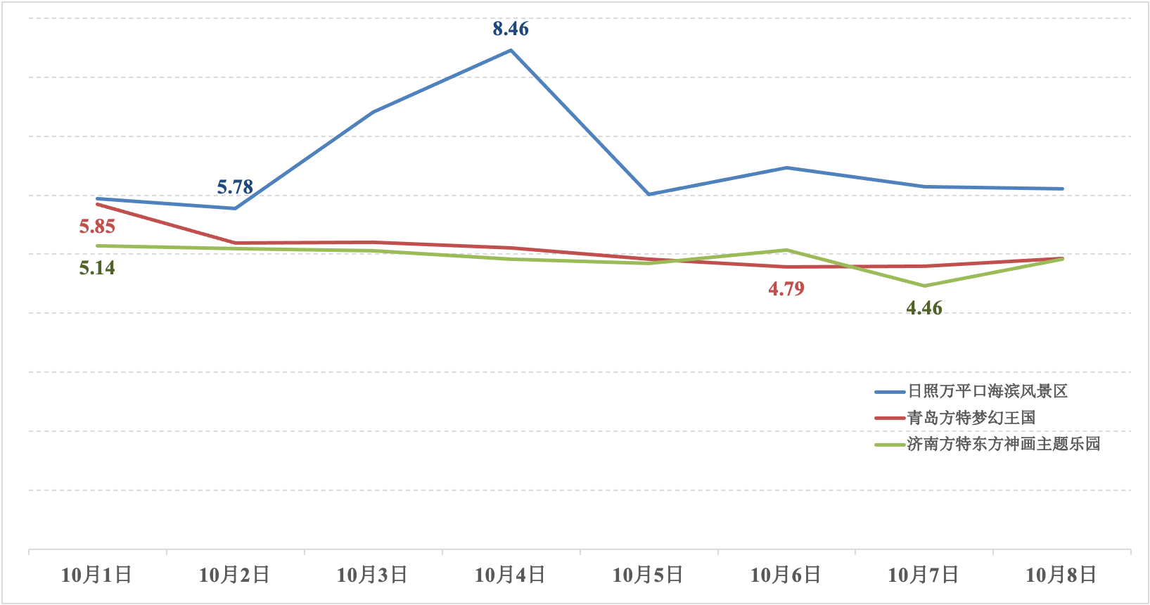 数据显示,10月1日至10月8日,山东40个热点景区的“追景指数”均值为5.87。排名前10位的分别是泰山风景区、天下第一泉风景区、日照万平口海滨风景区、青岛海滨风景区、崂山风景区、沂蒙山旅游区、青岛金沙滩景区、台儿庄古城景区、烟台蓬莱阁旅游区(三仙山·八仙过海)、青州古城旅游区。假期单日分值浮动较大的是日照万平口海滨风景区、青岛方特梦幻王国和济南方特东方神画主题乐园,追景指数分别变动2.68、1.06和0.68,表现十分亮眼。
