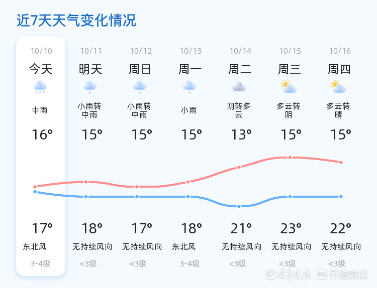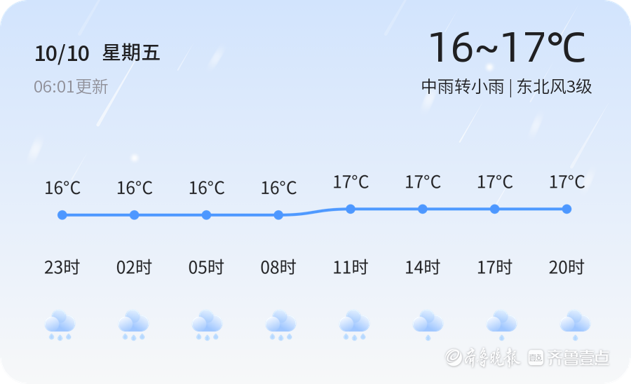 今天是2025年10月10日,星期五,农历八月十九。东营市今天迎来持续降雨天气,预计今天白天到夜间,全市范围内有中雨转小雨,气温在16℃至17℃之间。东北风3级,空气湿度高达98%,PM2.5指数为19,空气质量良好。