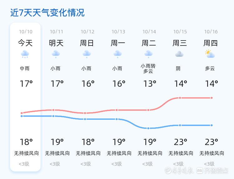 明天(10月11日)潍坊市仍将以小雨天气为主,与今天相比,降雨强度略有减弱,但气温将小幅上升,最低气温17℃,最高气温19℃。风力继续保持在无持续风向,风力小于3级,空气湿度依然较大,市民出行需继续携带雨具。