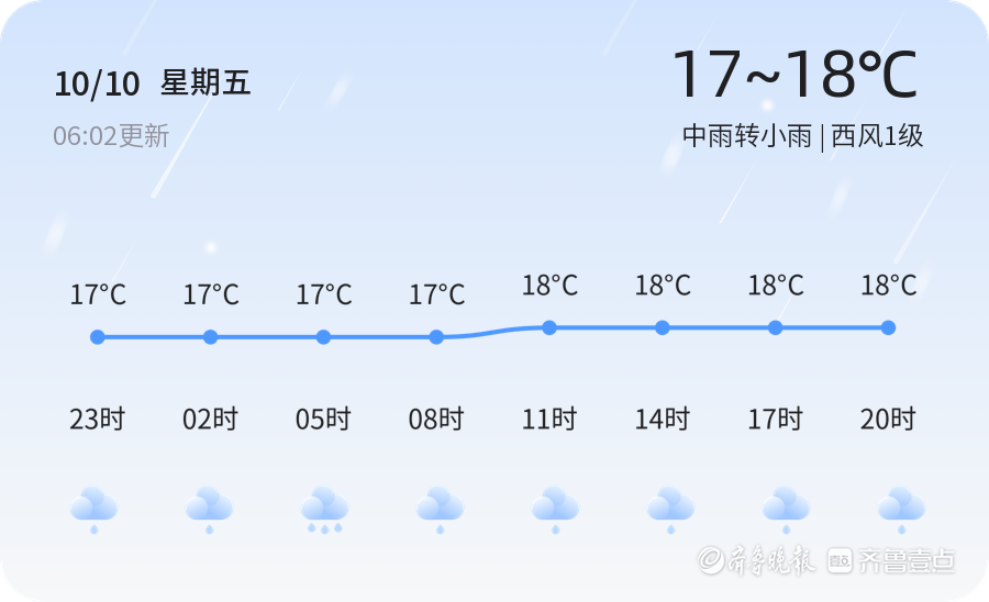 今天是10月10日,星期五,农历八月十九。潍坊市迎来中雨转小雨天气,气温较为舒适,全天温度在17℃至18℃之间,空气湿度达到100%,体感稍凉。目前,潍坊各区天气情况基本一致,均为中雨转小雨,风力较小,以西风1级为主,空气质量良好,PM2.5指数为12。