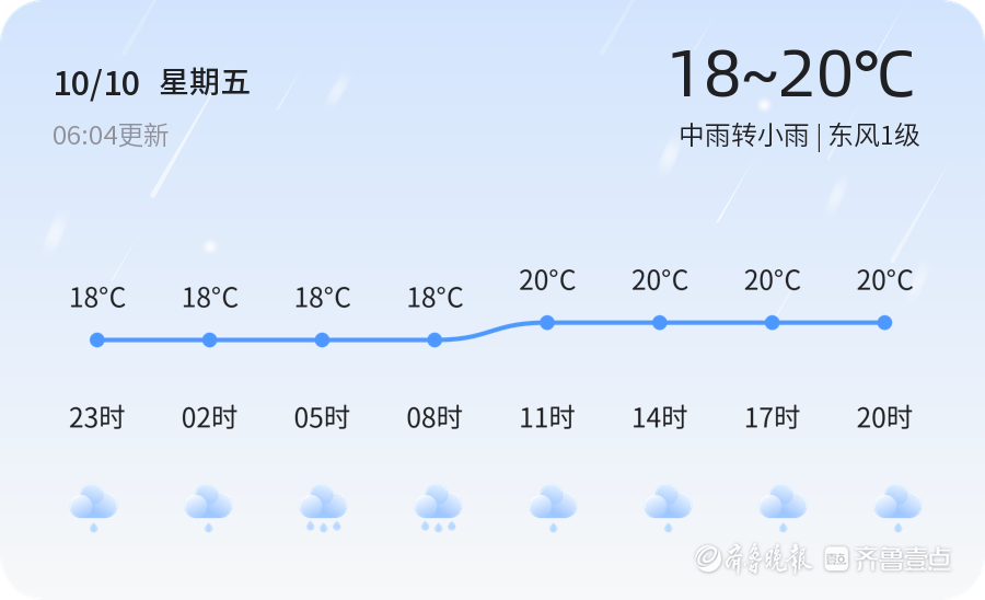 今日是10月10日,星期五,农历八月十九。威海市今日天气以中雨转小雨为主,气温在18℃至20℃之间,东风1级,空气湿度高达98%,PM2.5指数为18,空气质量良好。各区均受到不同程度的降雨影响,市民出行需携带雨具,注意安全。
