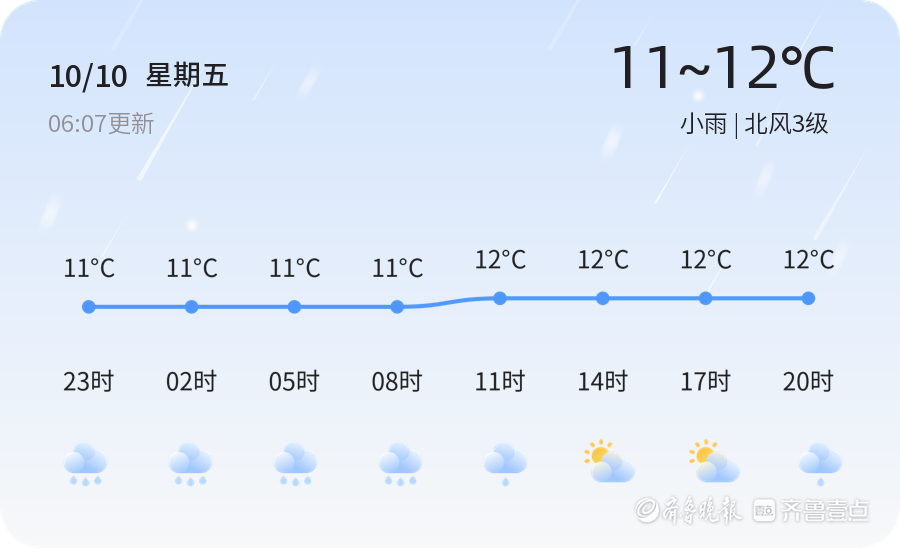 今天是10月10日,星期五,农历八月十九。菏泽市今天天气以小雨为主,气温在11℃到12℃之间,北风3级,空气湿度为94%,PM2.5指数为10,属于优级,空气质量良好。今日的小雨天气对市民出行有一定影响,建议市民外出携带雨具,注意交通安全,减速慢行,保持车距,确保行车安全。同时,雨天路滑,行人出行时也应小心慢行,避免滑倒。另外,今日气温较低,建议市民适时增添衣物,注意保暖。未来三天,菏泽市天气趋势为10月10日到10月12日,天气以小雨为主,气温在11℃到17℃之间。10月13日有中雨转小雨,气温在13℃到15℃之间。降雨天气将持续,市民需注意防范降雨可能带来的道路湿滑和能见度降低等不利影响。特别提醒司机朋友,雨天行车时应保持安全车距,避免急刹车,确保行车安全。温馨提示