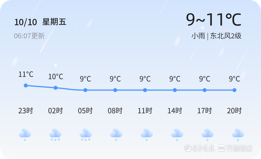 今天是2025年10月10日,农历八月十九,星期五。德州市今日天气以小雨为主,气温在9℃至11℃之间,东北风2级,空气湿度高达96%。空气质量状况为优级,PM2.5指数仅为14,非常适宜市民户外活动。然而,由于持续降雨,道路较为湿滑,建议市民出行时注意交通安全,特别是驾车时保持车距,减速慢行,以确保行车安全。此外,雨天容易引发路面低能见度,市民出行时应携带雨具,避免长时间在户外逗留。