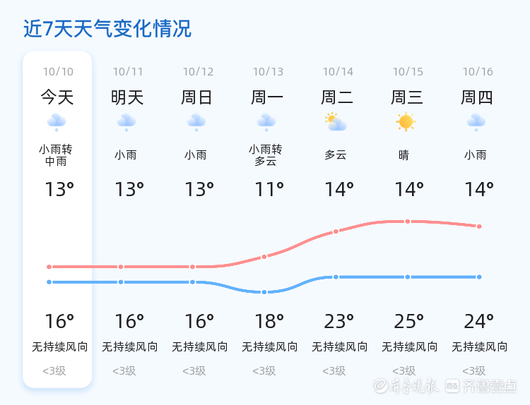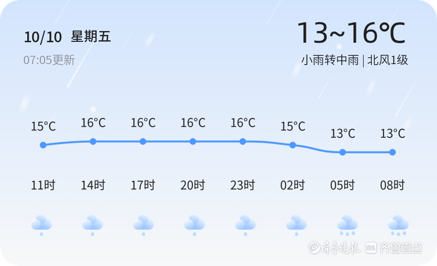 今日是2025年10月10日,农历八月十九,星期五。济南市今天迎来了一轮持续的阴雨天气,气温在13℃至16℃之间,整体湿度较大。早晨7点,济南市大部分地区已开始出现小雨,预计白天将逐渐转为中雨,北风1级,空气湿度高达98%。各区的天气情况基本一致,市民需注意防寒保暖,携带雨具出行。PM2.5指数为11,空气质量良好。