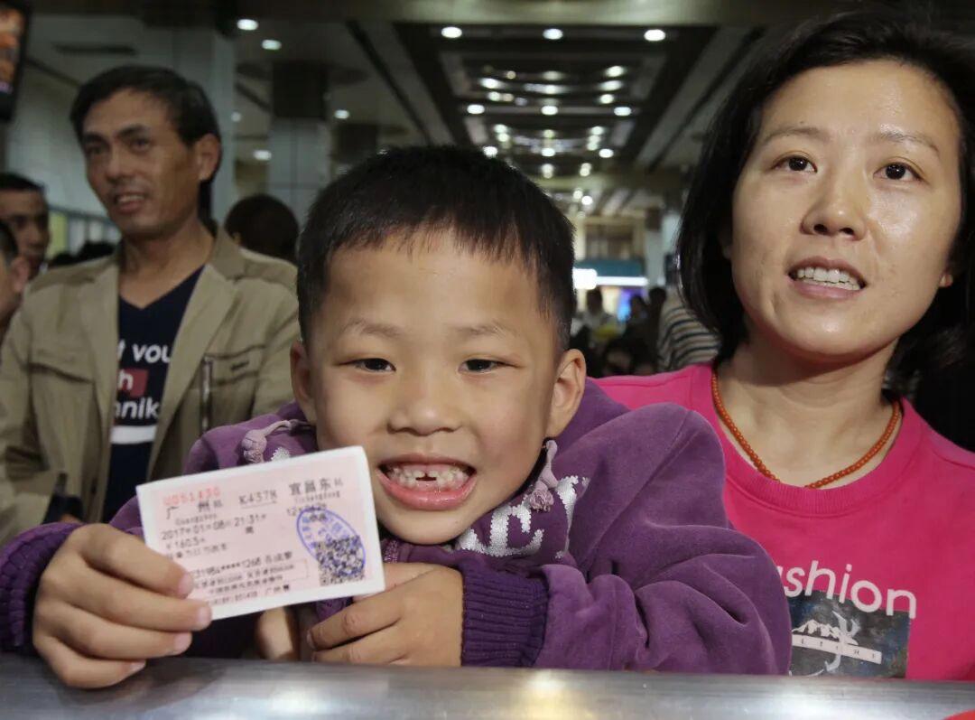 广州火车站,小男孩害羞地展示和妈妈回宜昌的车票。