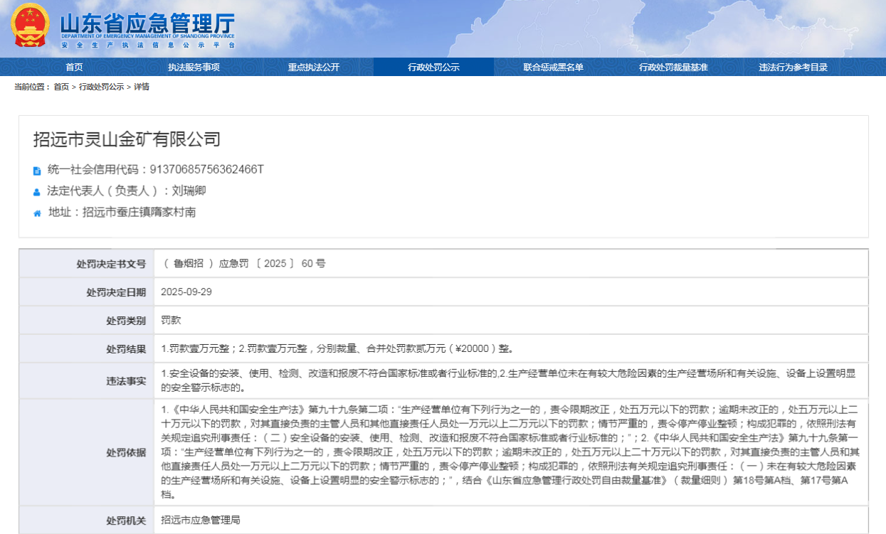齐鲁晚报·齐鲁壹点记者于山东省应急厅官网行政处罚公示栏了解到,近日,中矿金业旗下的招远市灵山金矿有限公司(下称“灵山金矿”)收到罚单,处罚机关为招远市应急管理局。