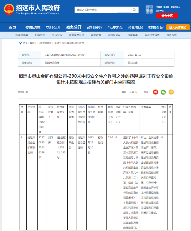 此外,据招远市人民政府政务公开栏内容,灵山金矿还曾因其-290米中段安全生产许可之外的巷道掘进工程安全设施设计未按照规定报经有关部门审查同意,被招远市应急管理局罚款15万元。行政处罚决定书文号为(鲁烟招)应急罚〔2023〕295号。