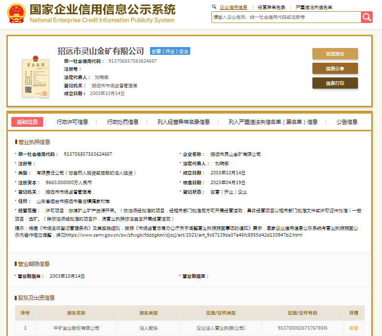 国家企业信用信息公示系统显示,招远市灵山金矿有限公司成立于2003年,注册资本9660万元人民币,法定代表人为刘瑞卿,公司由中矿金业股份有限公司全资持股,后者大股东为山东中矿集团有限公司。