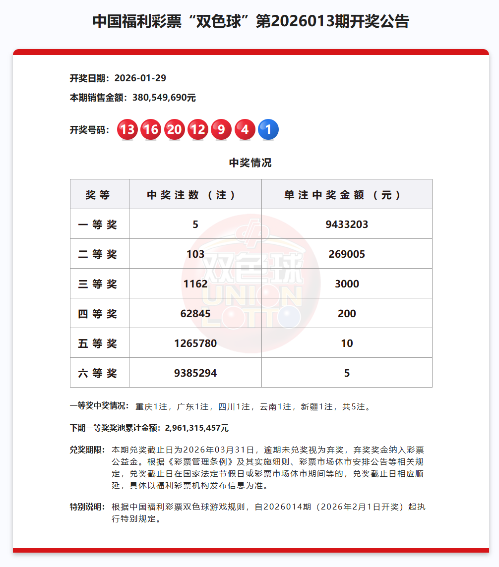双色球开奖 第2026013期 1月29日 开奖号码 一等奖 重庆(1注)广东(1注) 四川(1注)云南(1注) 新疆(1注) 奖池金额29.61亿元 本期销量 3.80亿元 筹集公益金 1.36亿元 特别说明:根据中国福利彩票双色球游戏规则,自2026014期(2026年2月1日开奖)起执行特别规定。 量力而行 理性购彩 (来源:“中国福彩”微信公众号)